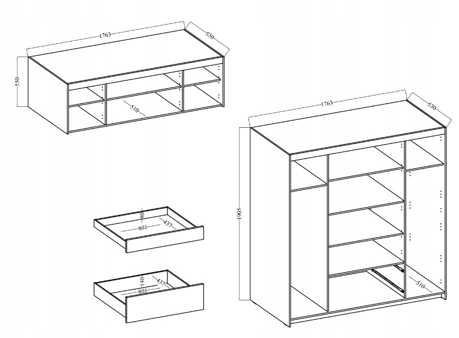 - Szafka zawiera półki, 2 drążki na wieszaki oraz 2 szuflady