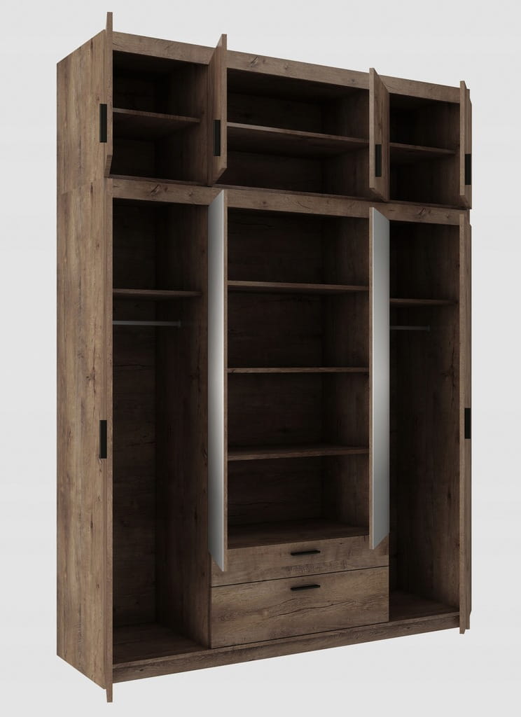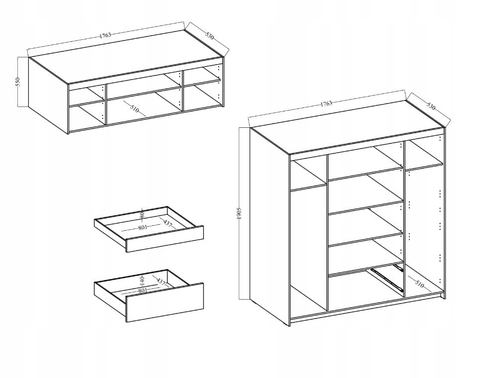 - Szafka zawiera półki, 2 drążki na wieszaki oraz 2 szuflady