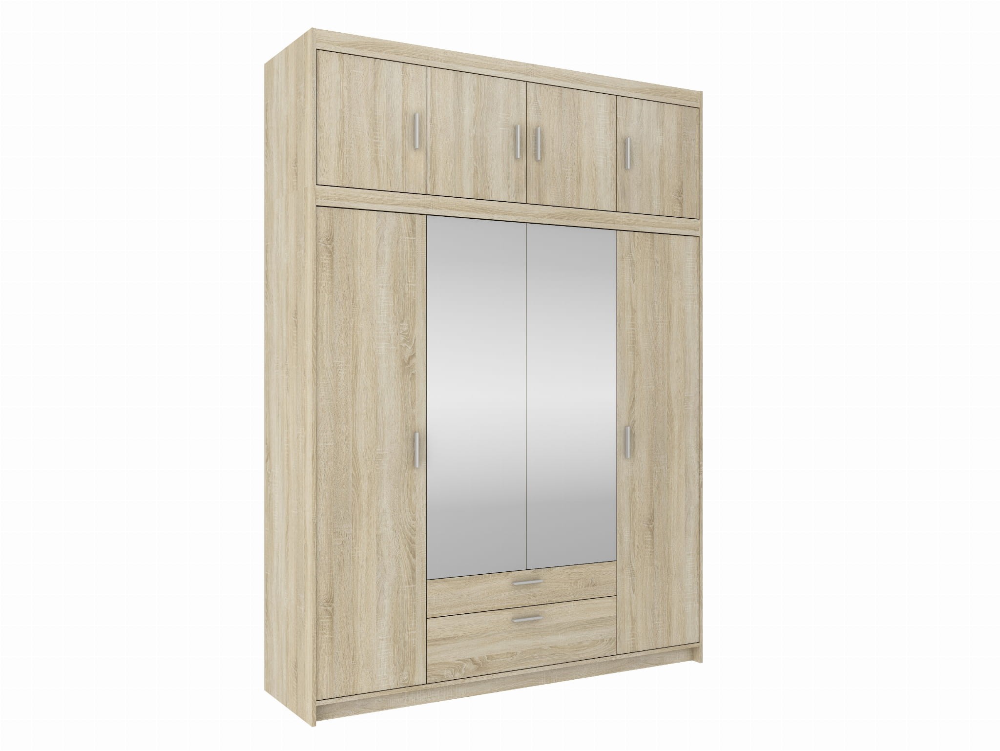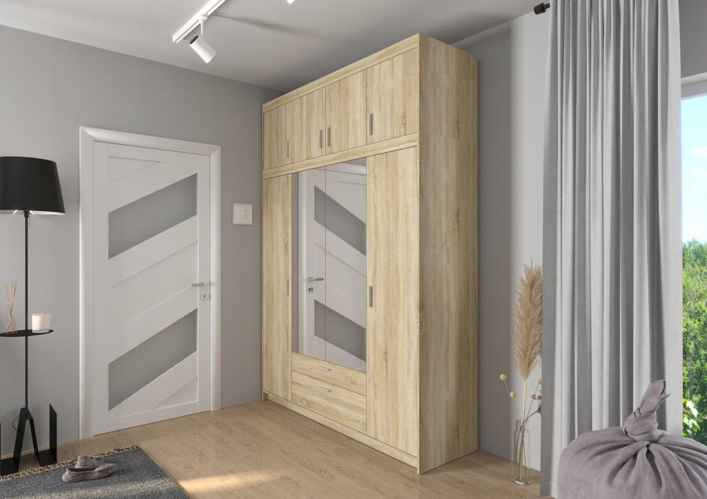 Szafa czterodrzwiowa KLEO 176 cm z lustrem i szufladami – Dąb Sonoma, pojemna garderoba
