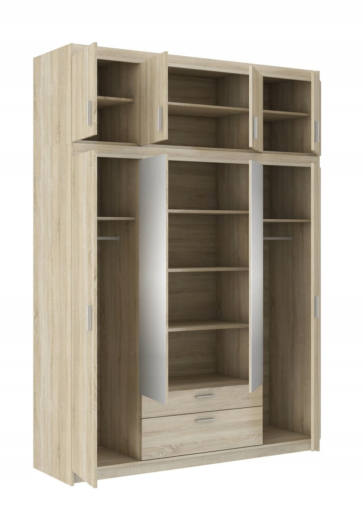 - Szafka zawiera półki, 2 drążki na wieszaki oraz 2 szuflady