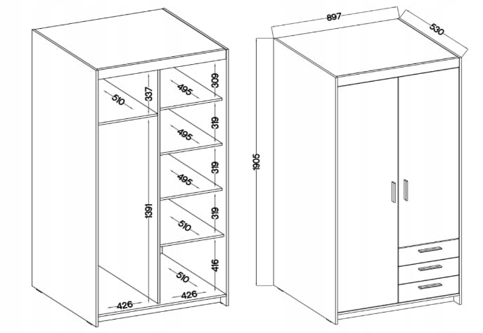 - Szafa dwuodrzwiowa wyposażona w 5 półek, drążek na wieszaki oraz trzy szuflady