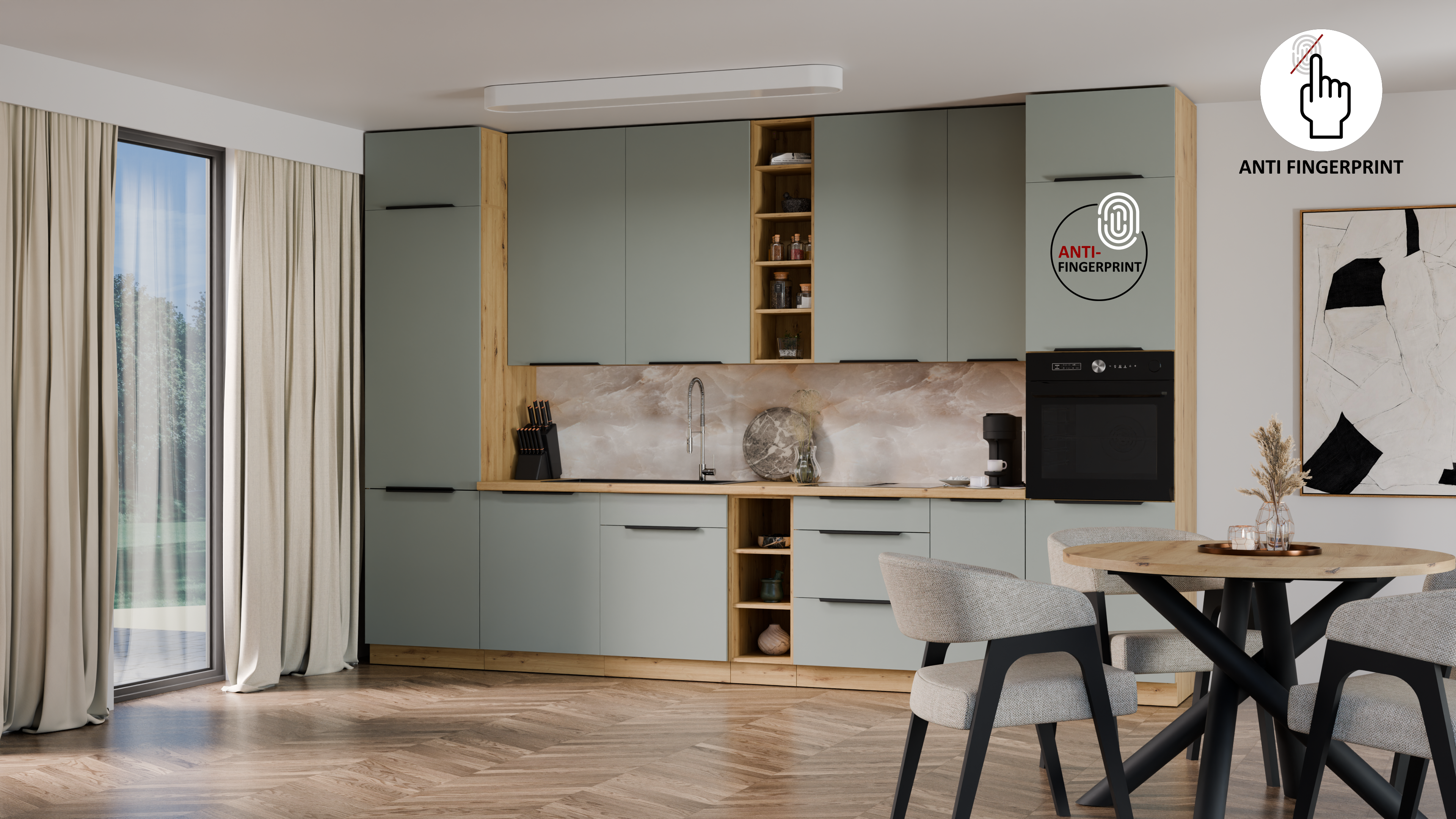 ☑️ Fronty z powłoką ANTI-FINGERPRINT – nowoczesna technologia, która skutecznie ogranicza ślady palców i ułatwia utrzymanie mebli w idealnej czystości. Matowe wykończenie nadaje frontom elegancki wygląd i sprawia, że są przyjemne w dotyku.