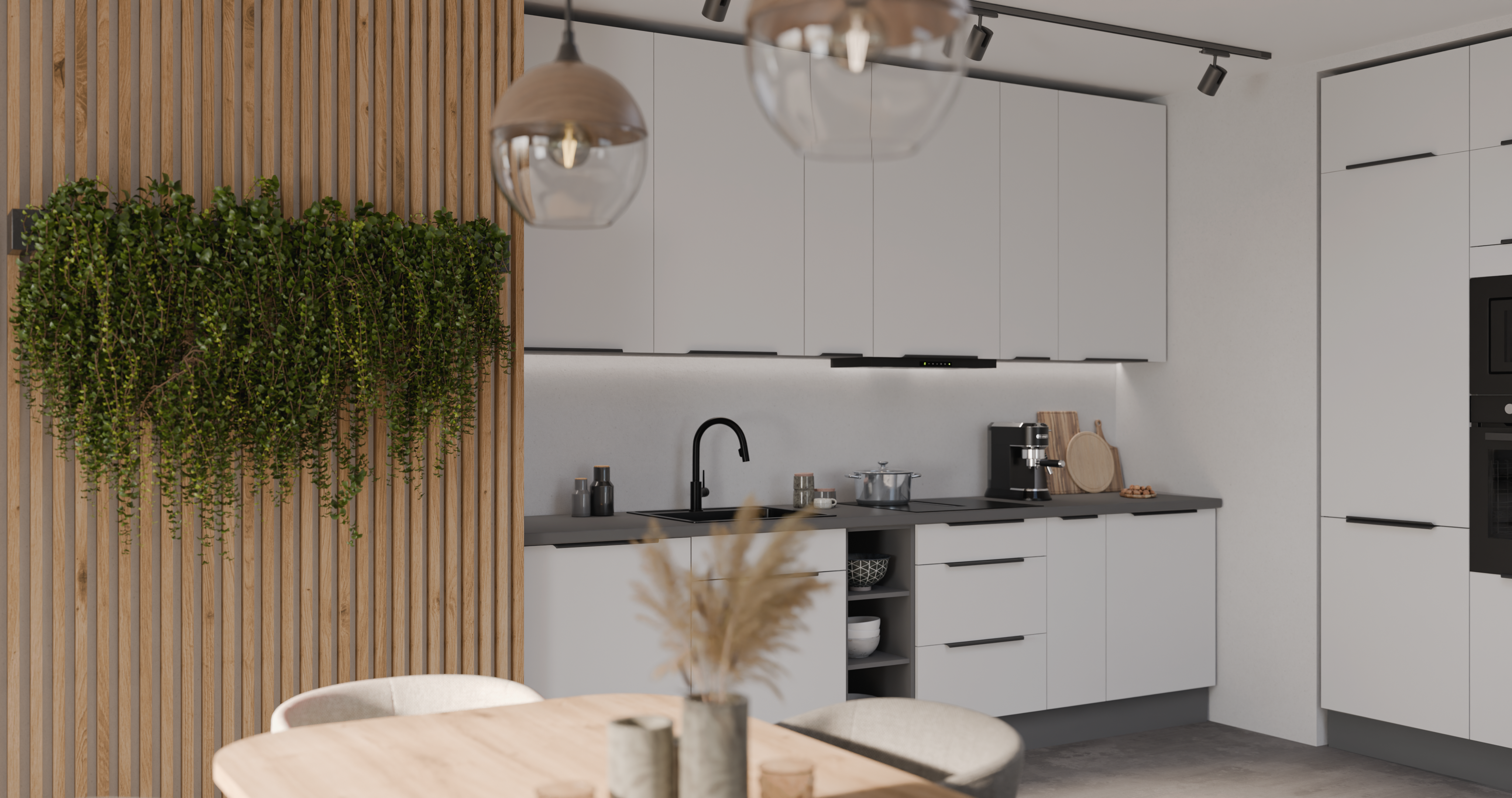 CALIA to nowoczesna kolekcja mebli kuchennych, łącząca styl, funkcjonalność i najwyższą jakość wykonania. Jej największym wyróżnikiem są fronty pokryte innowacyjną powłoką ANTI-FINGERPRINT, która skutecznie ogranicza powstawanie śladów palców. Dzięki niej powierzchnie mebli pozostają czyste i estetyczne na dłużej, a matowe wykończenie frontów nadaje im elegancki, nowoczesny charakter.