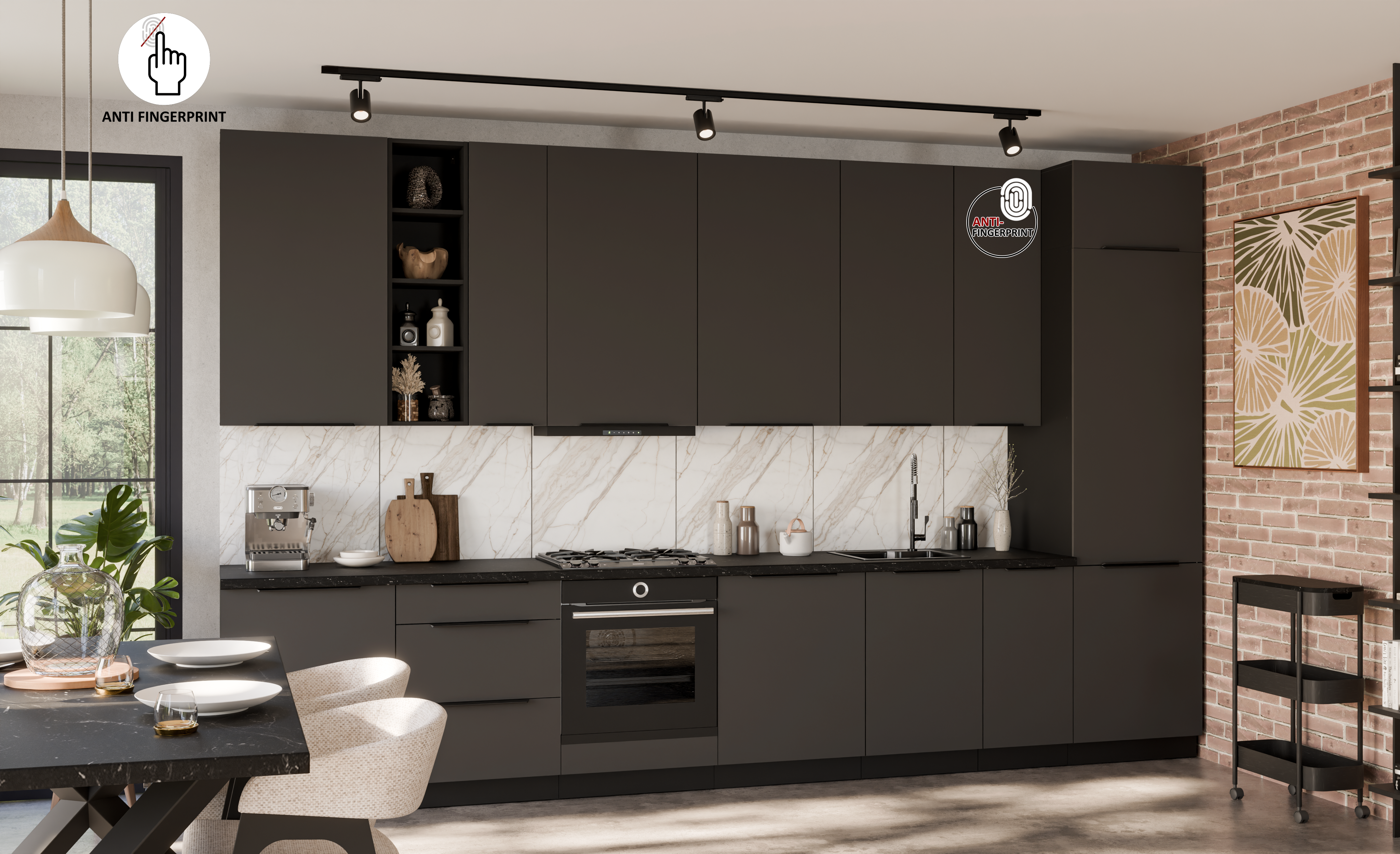 CALIA to nowoczesna kolekcja mebli kuchennych, łącząca styl, funkcjonalność i najwyższą jakość wykonania. Jej największym wyróżnikiem są fronty pokryte innowacyjną powłoką ANTI-FINGERPRINT, która skutecznie ogranicza powstawanie śladów palców. Dzięki niej powierzchnie mebli pozostają czyste i estetyczne na dłużej, a matowe wykończenie frontów nadaje im elegancki, nowoczesny charakter.
