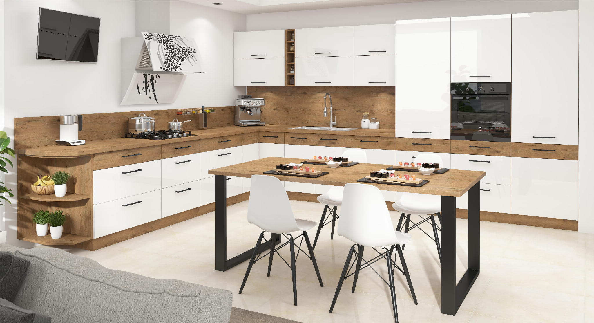 ☑️ Kolekcja mebli kuchennych SARA łączy biały połysk z ciepłym dekorem dąb lancelot, tworząc elegancką i funkcjonalną zabudowę. Modułowe szafki pozwalają dopasować układ kuchni do własnych potrzeb, a system cichego domyku i prowadnice PREMIUM BOX gwarantują wygodę codziennego użytkowania.