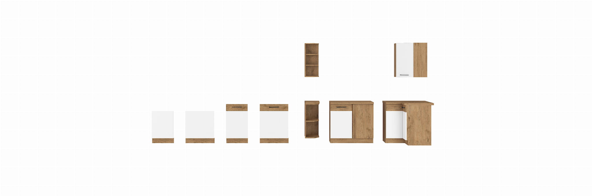 ☑️ Nowoczesna estetyka – Kolekcja mebli kuchennych SARA to idealne połączenie nowoczesnej elegancji i funkcjonalności. Fronty dolnych szafek oraz słupków wyróżniają się efektownym zestawieniem bieli w połysku i dębu lancelot, podczas gdy fronty szafek górnych utrzymane zostały w jednolitej, białej tafli połysku.