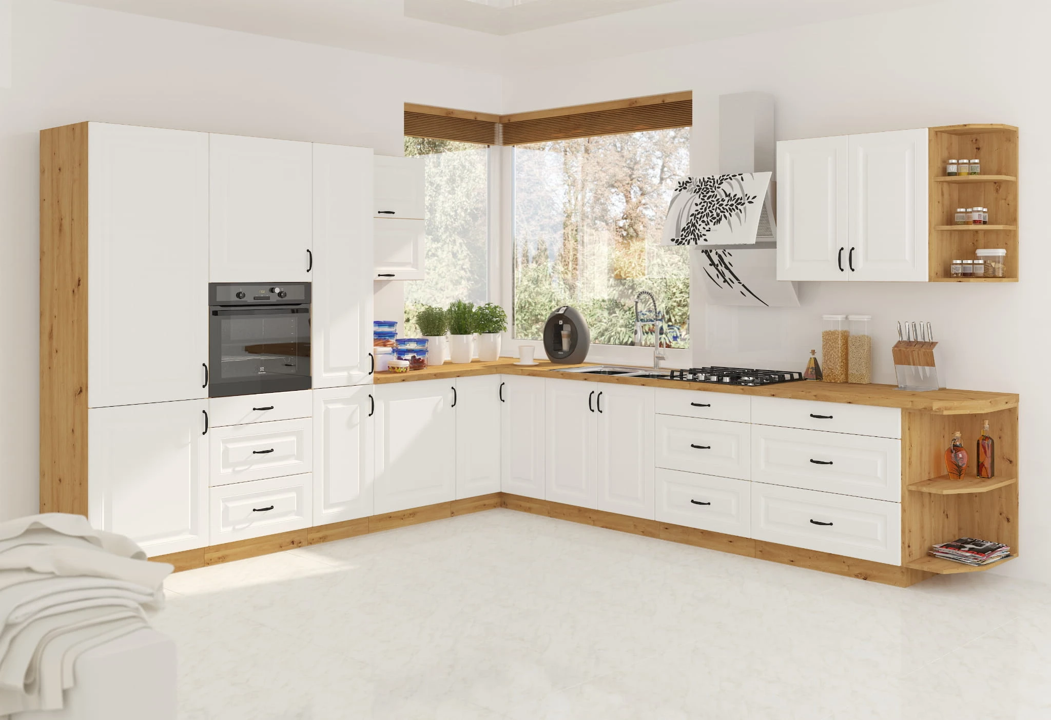 - Białe matowe fronty z frezami + korpus w kolorze dąb artisan