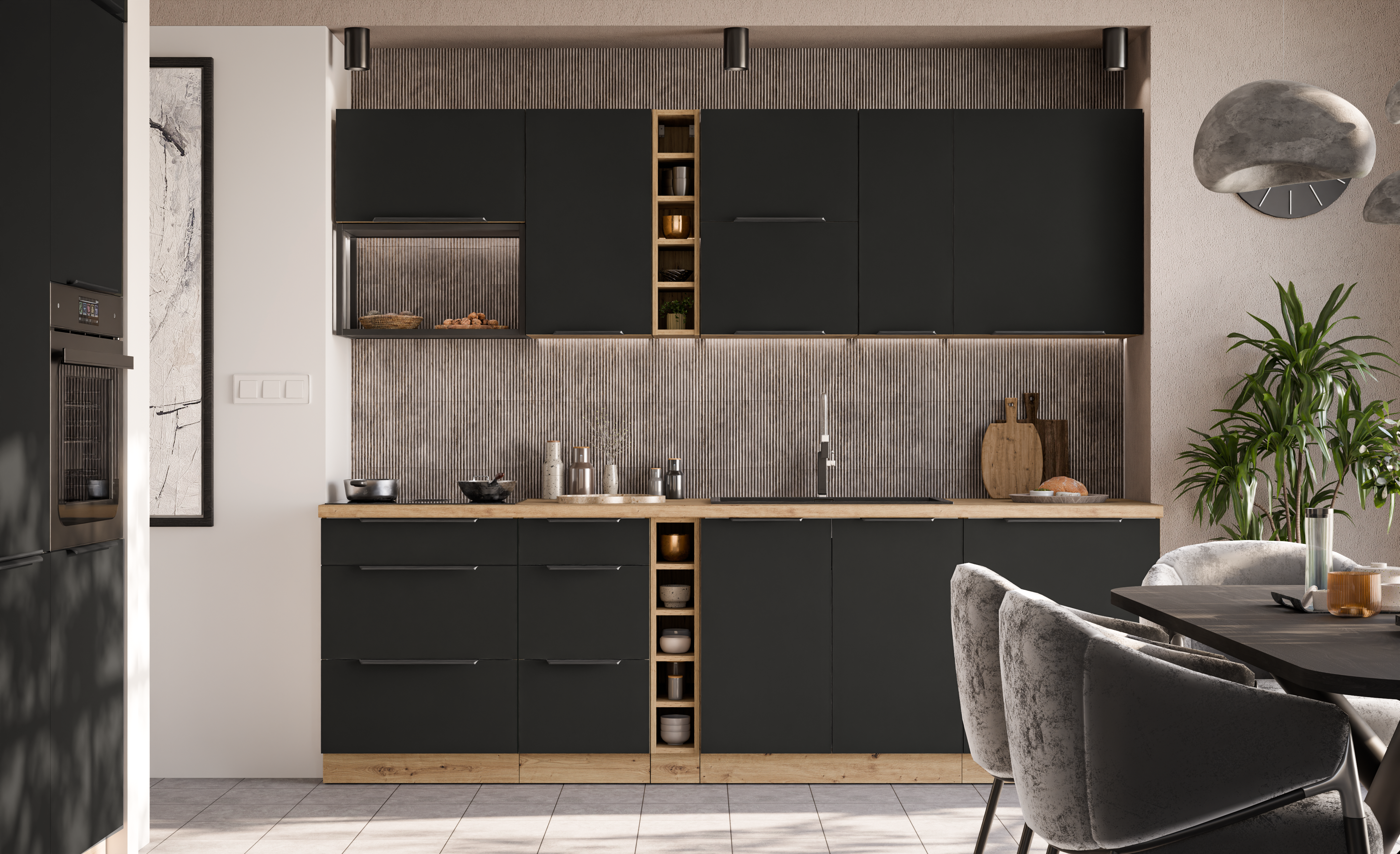 ☑️ Różne wysokości szafek górnych – kolekcja oferuje szafki wiszące w trzech wariantach: 72 cm, 90 cm i 108 cm, co pozwala idealnie dopasować zabudowę do wymiarów i charakteru każdej kuchni.