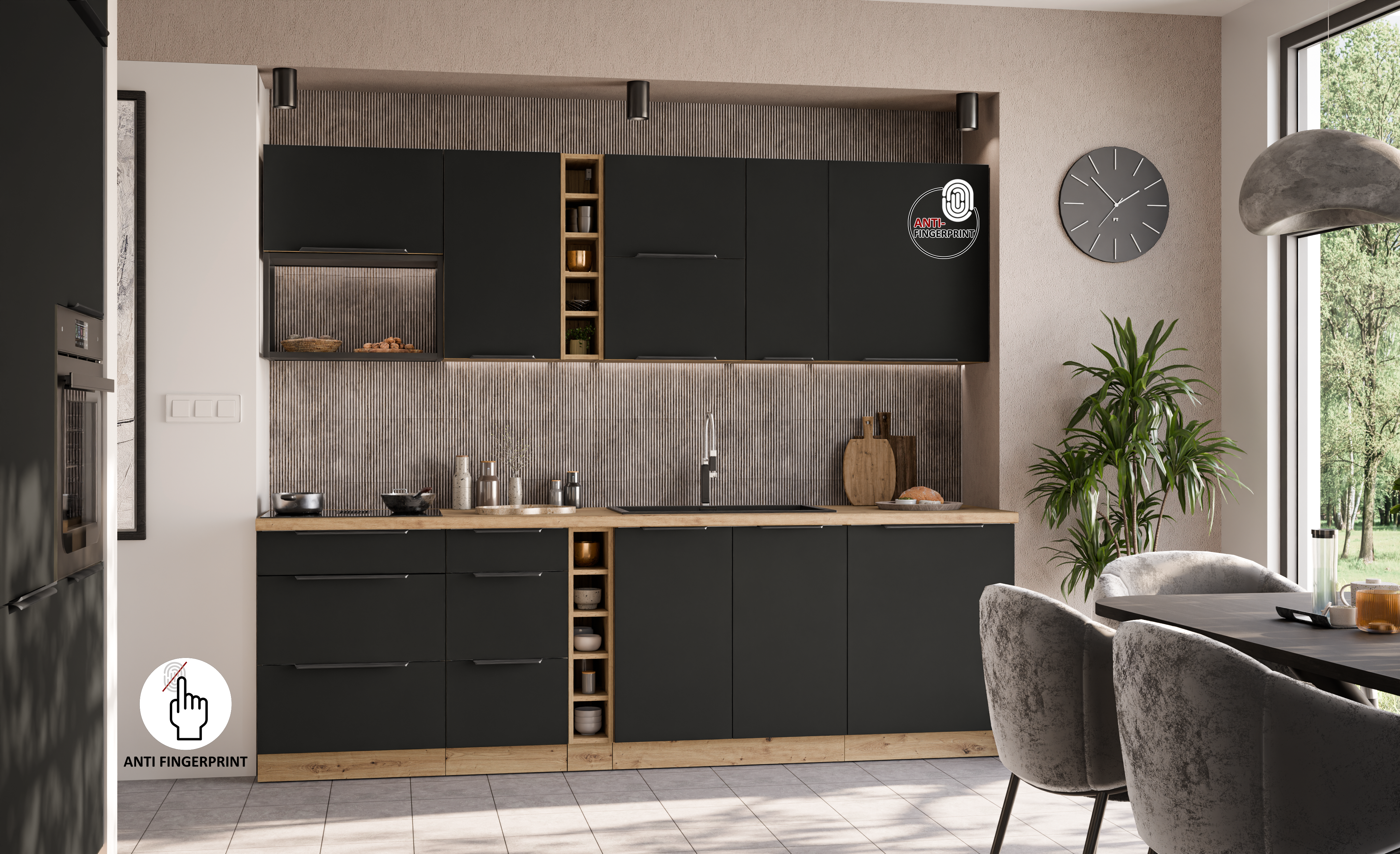 ☑️ Fronty z powłoką ANTI-FINGERPRINT – nowoczesna technologia, która skutecznie ogranicza ślady palców i ułatwia utrzymanie mebli w idealnej czystości. Matowe wykończenie nadaje frontom elegancki wygląd i sprawia, że są przyjemne w dotyku.