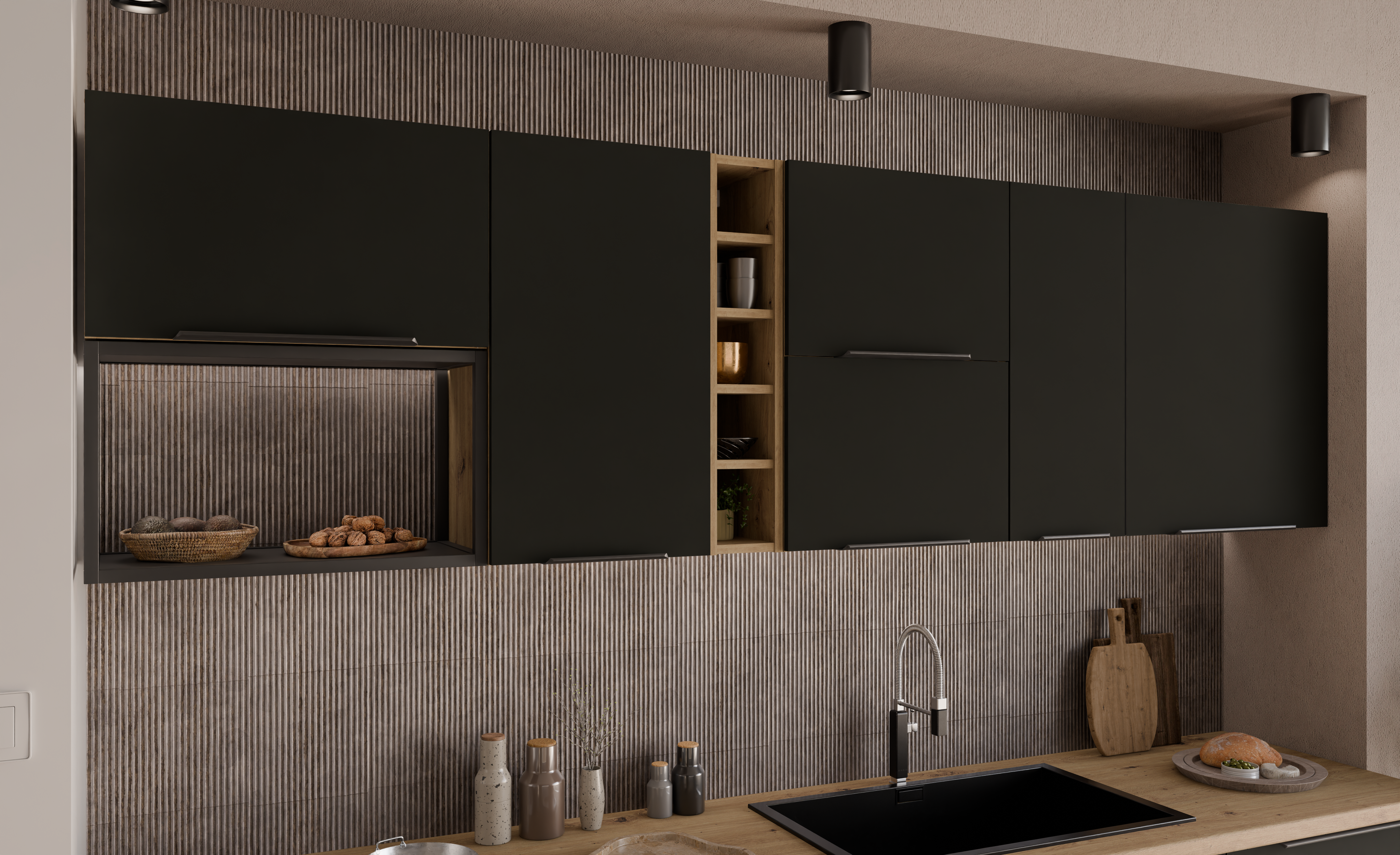 ☑️ Różne wysokości szafek górnych – kolekcja oferuje szafki wiszące w trzech wariantach: 72 cm, 90 cm i 108 cm, co pozwala idealnie dopasować zabudowę do wymiarów i charakteru każdej kuchni.
