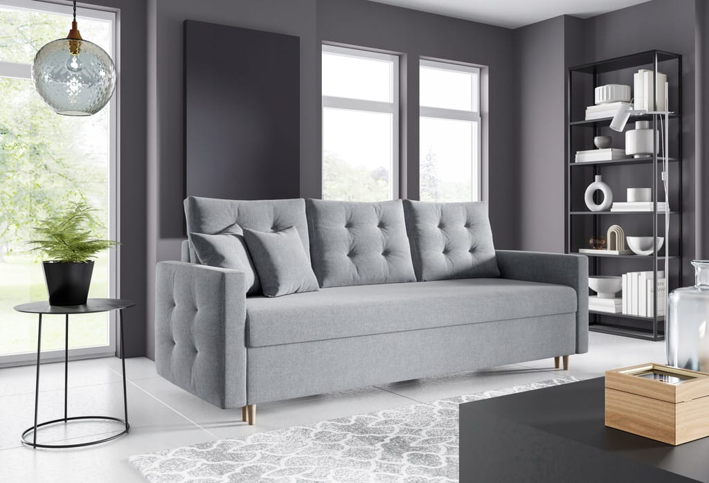 - Pojemnik na pościel: Umożliwia on łatwe przechowywanie pościeli, co oszczędza miejsce, utrzymuje porządek i podnosi komfort codziennego użytkowania kanapy.