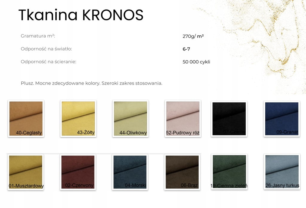 Kronos to mocna, zwarta, pleciona tkanina, która zalicza się do tkanin typu plusz. Posiada gęste i miłe w dotyku włosie.