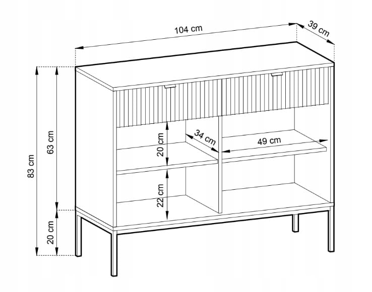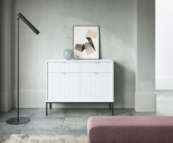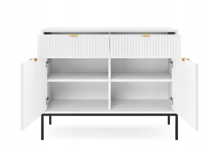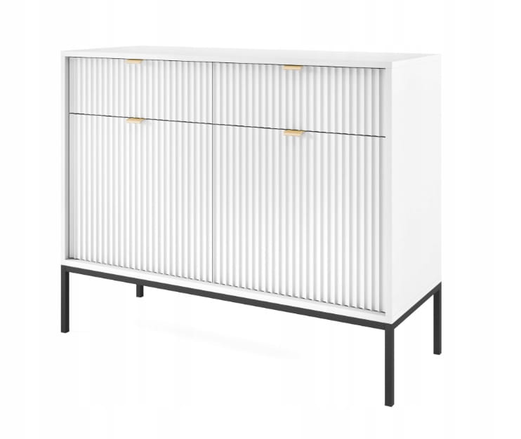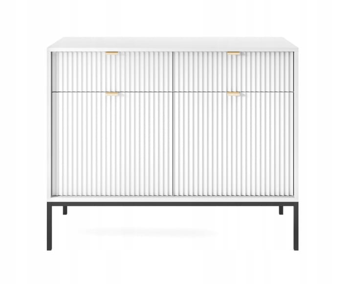 Komoda dwudrzwiowa z szufladami ZANZI sprawdzi się zarówno w nowoczesnych, jak i klasycznych wnętrzach, dodając im wyrafinowanego stylu. Dzięki frezowanym frontom mebel zyskuje dynamiczną strukturę, która odświeża wygląd wnętrza, nadając mu wyjątkowy charakter. Smukłe, wysokie nogi na stelażu nadają komodzie szyku a zarazem ułatwiają utrzymanie porządku.