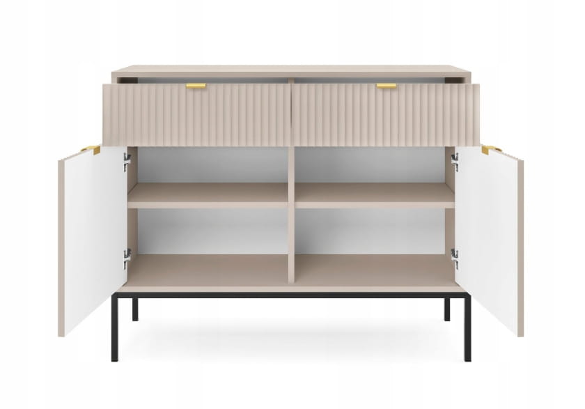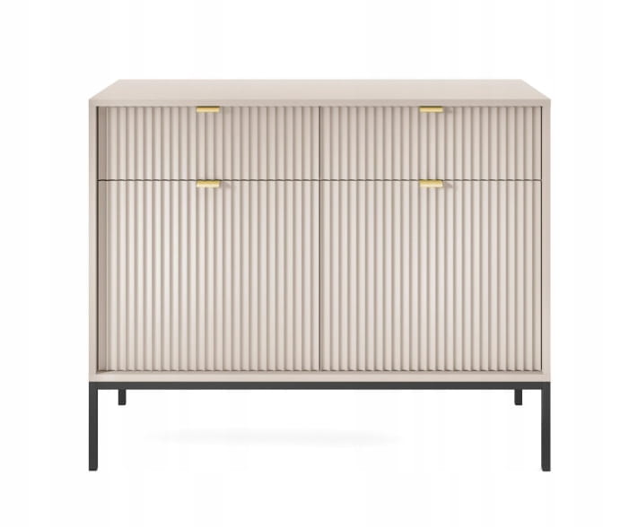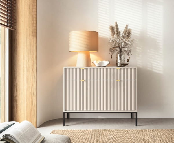 Komoda dwudrzwiowa z szufladami ZANZI sprawdzi się zarówno w nowoczesnych, jak i klasycznych wnętrzach, dodając im wyrafinowanego stylu. Dzięki frezowanym frontom mebel zyskuje dynamiczną strukturę, która odświeża wygląd wnętrza, nadając mu wyjątkowy charakter. Smukłe, wysokie nogi na stelażu nadają komodzie szyku a zarazem ułatwiają utrzymanie porządku.