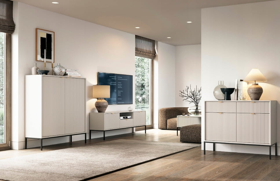 Jeśli chcesz dodać swojemu mieszkaniu nowoczesnego i eleganckiego charakteru, wybór mebli z lamelami ,,ZANZI" to strzał w dziesiątkę! Ich unikalny design sprawia, że każde wnętrze zyskuje wyjątkowy styl. ✨