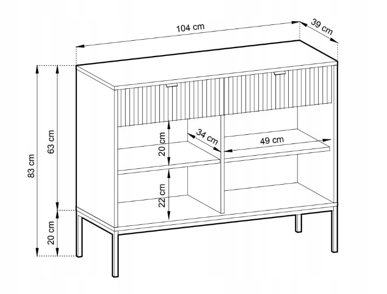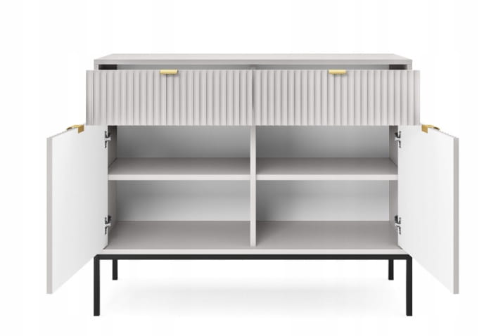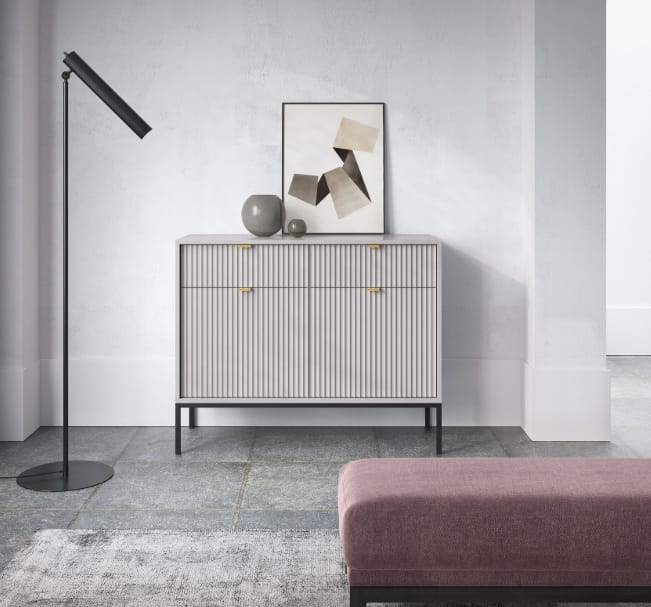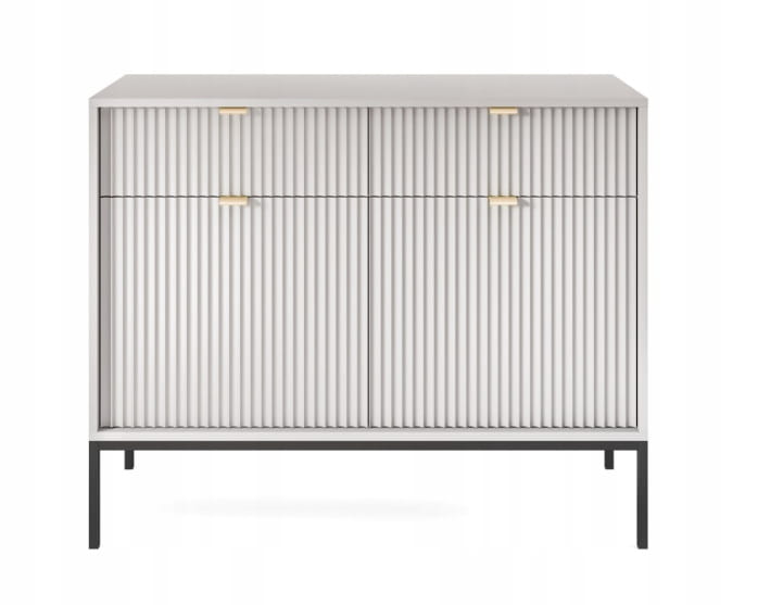 Komoda dwudrzwiowa z szufladami ZANZI sprawdzi się zarówno w nowoczesnych, jak i klasycznych wnętrzach, dodając im wyrafinowanego stylu. Dzięki frezowanym frontom mebel zyskuje dynamiczną strukturę, która odświeża wygląd wnętrza, nadając mu wyjątkowy charakter. Smukłe, wysokie nogi na stelażu nadają komodzie szyku a zarazem ułatwiają utrzymanie porządku.