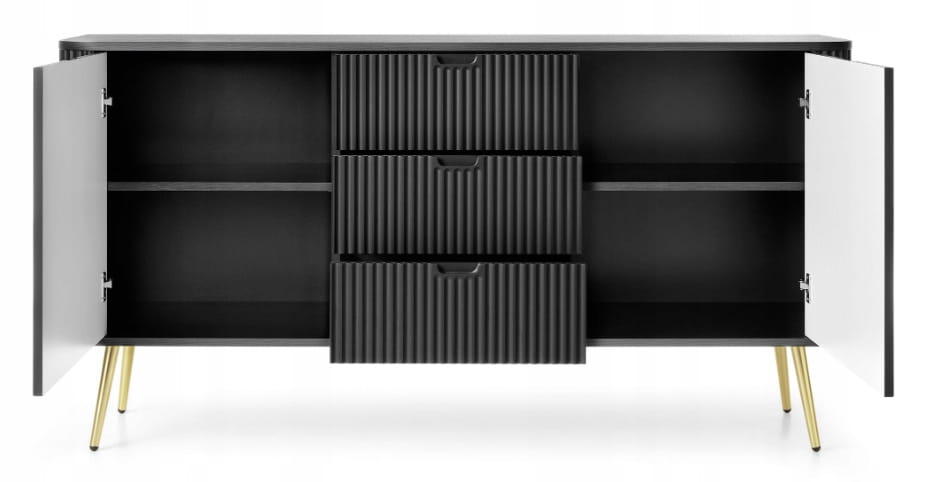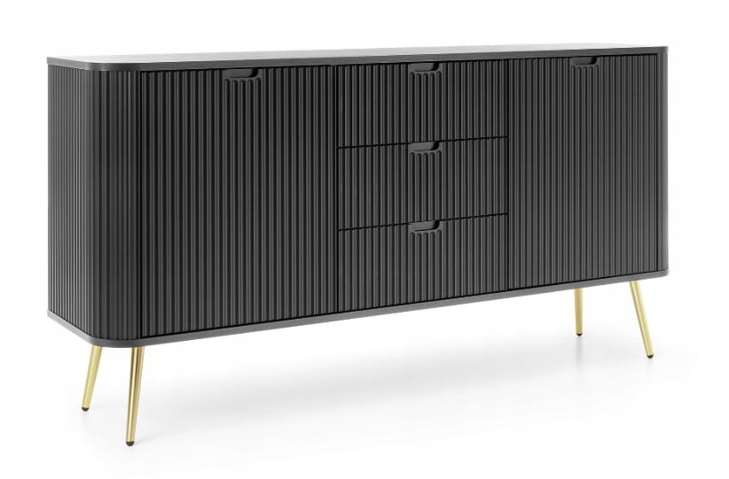 Komoda 2D 3S FROZEN 170 x 90 x 39 cm frezowany front CZARNY / ZŁOTE NOGI