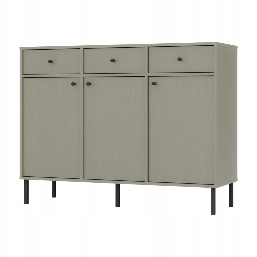 Klikając ,, kup teraz '' zamawiasz komodę trzydrzwiową z trzema szufladami SYDNEY 2 na czarnej nodze prostej w odcieniu Eucaliptus ! W celu zamówienia innego rodzaju komody zapraszamy na pozostałe nasze aukcje.