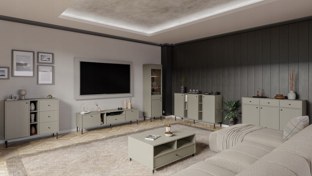 Komoda trzydrzwiowa z szufladami z kolekcji SYDNEY inspirowana japońską równowagą i spokojem. Ta elegancka szafka w odcieniu EUCALIPTUS wprowadzi do Twojego salonu harmonię i subtelną elegancję.