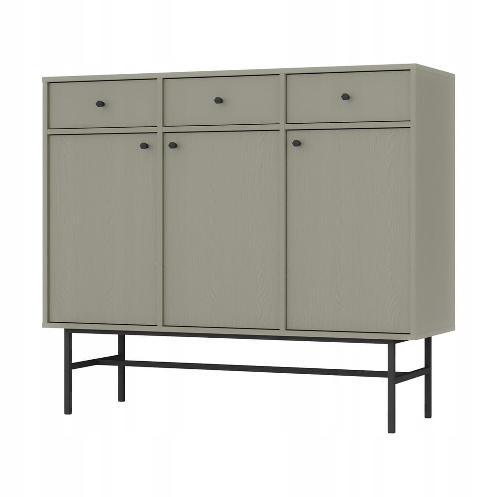 Klikając ,, kup teraz '' zamawiasz komodę trzydrzwiową z trzema szufladami SYDNEY 3 na czarnym stelażu w odcieniu Eucaliptus ! W celu zamówienia innego rodzaju komody zapraszamy na pozostałe nasze aukcje.