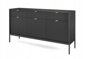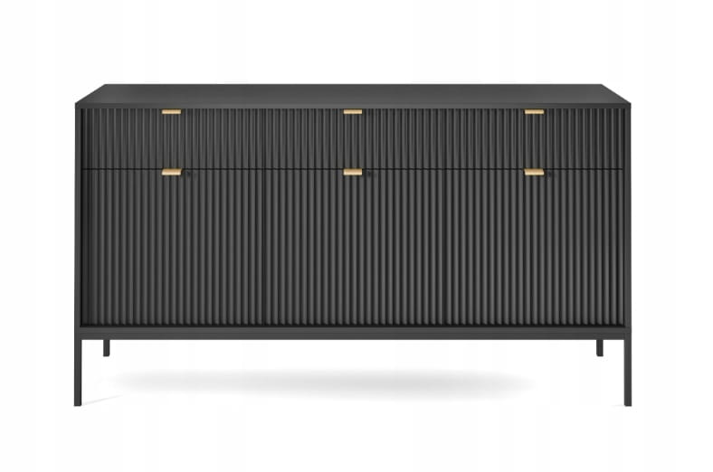 Komoda trzydrzwiowa z szufladami Zanzi 154 cm Czarna ryflowane fronty i czarny stelaż