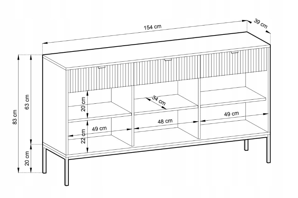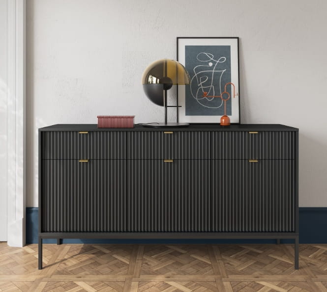 Komoda trzydrzwiowa z szufladami ZANZI sprawdzi się zarówno w nowoczesnych, jak i klasycznych wnętrzach, dodając im wyrafinowanego stylu. Dzięki frezowanym frontom mebel zyskuje dynamiczną strukturę, która odświeża wygląd wnętrza, nadając mu wyjątkowy charakter. Smukłe, wysokie nogi na stelażu nadają komodzie szyku a zarazem ułatwiają utrzymanie porządku.