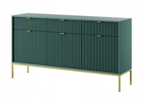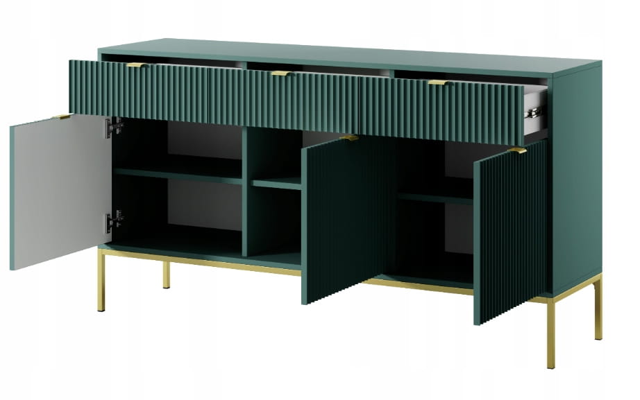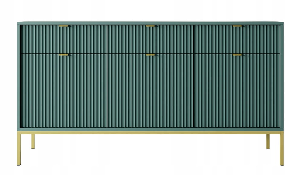 Komoda trzydrzwiowa z szufladami Zanzi 154 cm Zielona ryflowane fronty i złoty stelaż
