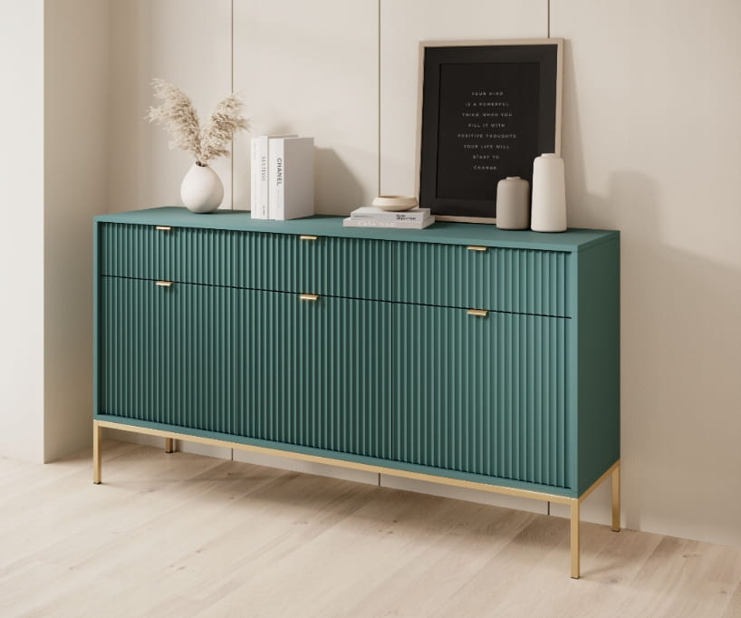 Komoda trzydrzwiowa z szufladami ZANZI sprawdzi się zarówno w nowoczesnych, jak i klasycznych wnętrzach, dodając im wyrafinowanego stylu. Dzięki frezowanym frontom mebel zyskuje dynamiczną strukturę, która odświeża wygląd wnętrza, nadając mu wyjątkowy charakter. Smukłe, wysokie nogi na stelażu nadają komodzie szyku a zarazem ułatwiają utrzymanie porządku.