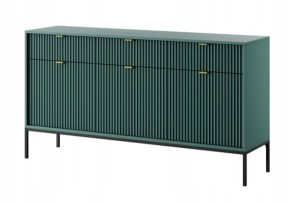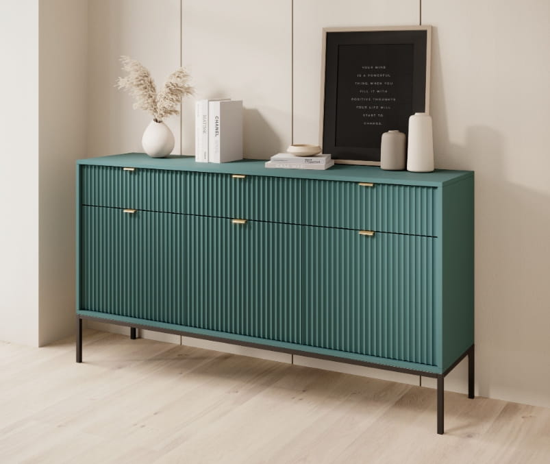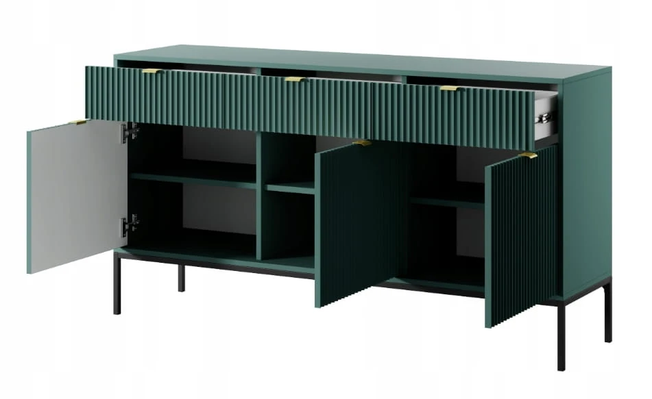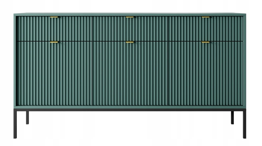 Komoda trzydrzwiowa z szufladami Zanzi 154 cm Zielona ryflowane fronty i czarny stelaż
