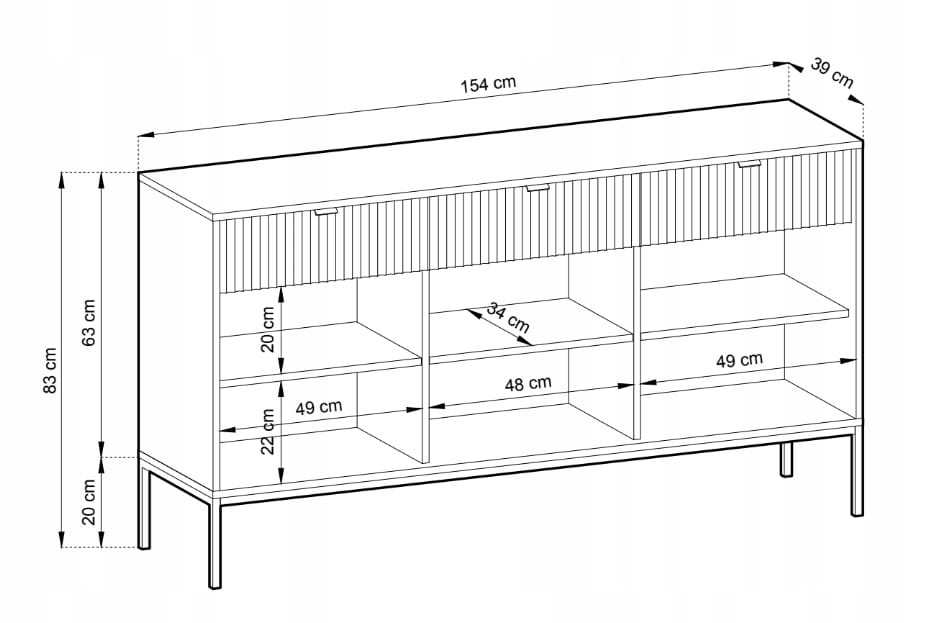 Komoda trzydrzwiowa z szufladami ZANZI sprawdzi się zarówno w nowoczesnych, jak i klasycznych wnętrzach, dodając im wyrafinowanego stylu. Dzięki frezowanym frontom mebel zyskuje dynamiczną strukturę, która odświeża wygląd wnętrza, nadając mu wyjątkowy charakter. Smukłe, wysokie nogi na stelażu nadają komodzie szyku a zarazem ułatwiają utrzymanie porządku.