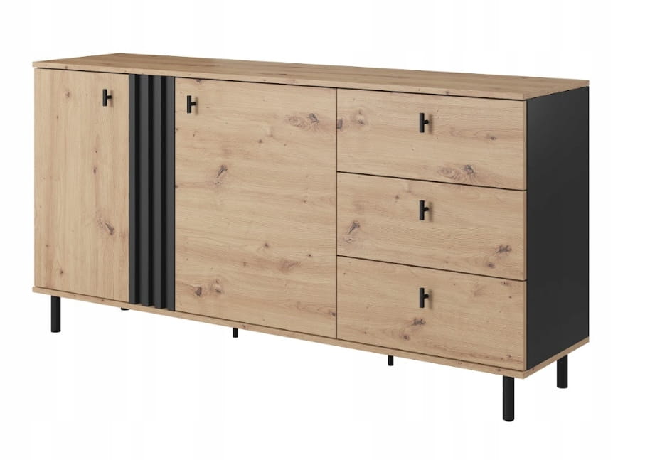 Komoda z kolekcji PABLO to połączenie stylu loftowego z nowoczesnymi akcentami. Doskonały wybór dla osób ceniących modny design, trwałość oraz funkcjonalność. Wyróżnia się oryginalnym połączeniem drewna w odcieniu dębu z czarnymi akcentami. Fakt występowania wielu półek i szuflad czyni komodę praktycznym meblem a starannie zaprojektowane detale dodają charakteru i przełamują monotonię. Idealna do salonu lub sypialni, komoda PABLO łączy nowoczesny design z najwyższą jakością wykonania.