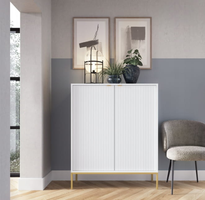 Komoda dwudrzwiowa ZANZI sprawdzi się zarówno w nowoczesnych, jak i klasycznych wnętrzach, dodając im wyrafinowanego stylu. Dzięki frezowanym frontom mebel zyskuje dynamiczną strukturę, która odświeża wygląd wnętrza, nadając mu wyjątkowy charakter. Smukłe, wysokie nogi na stelażu nadają komodzie szyku a zarazem ułatwiają utrzymanie porządku.