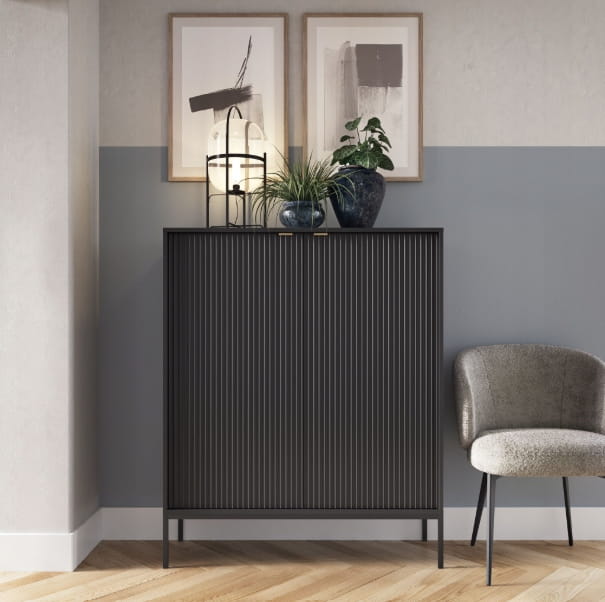 Komoda dwudrzwiowa ZANZI sprawdzi się zarówno w nowoczesnych, jak i klasycznych wnętrzach, dodając im wyrafinowanego stylu. Dzięki frezowanym frontom mebel zyskuje dynamiczną strukturę, która odświeża wygląd wnętrza, nadając mu wyjątkowy charakter. Smukłe, wysokie nogi na stelażu nadają komodzie szyku a zarazem ułatwiają utrzymanie porządku.