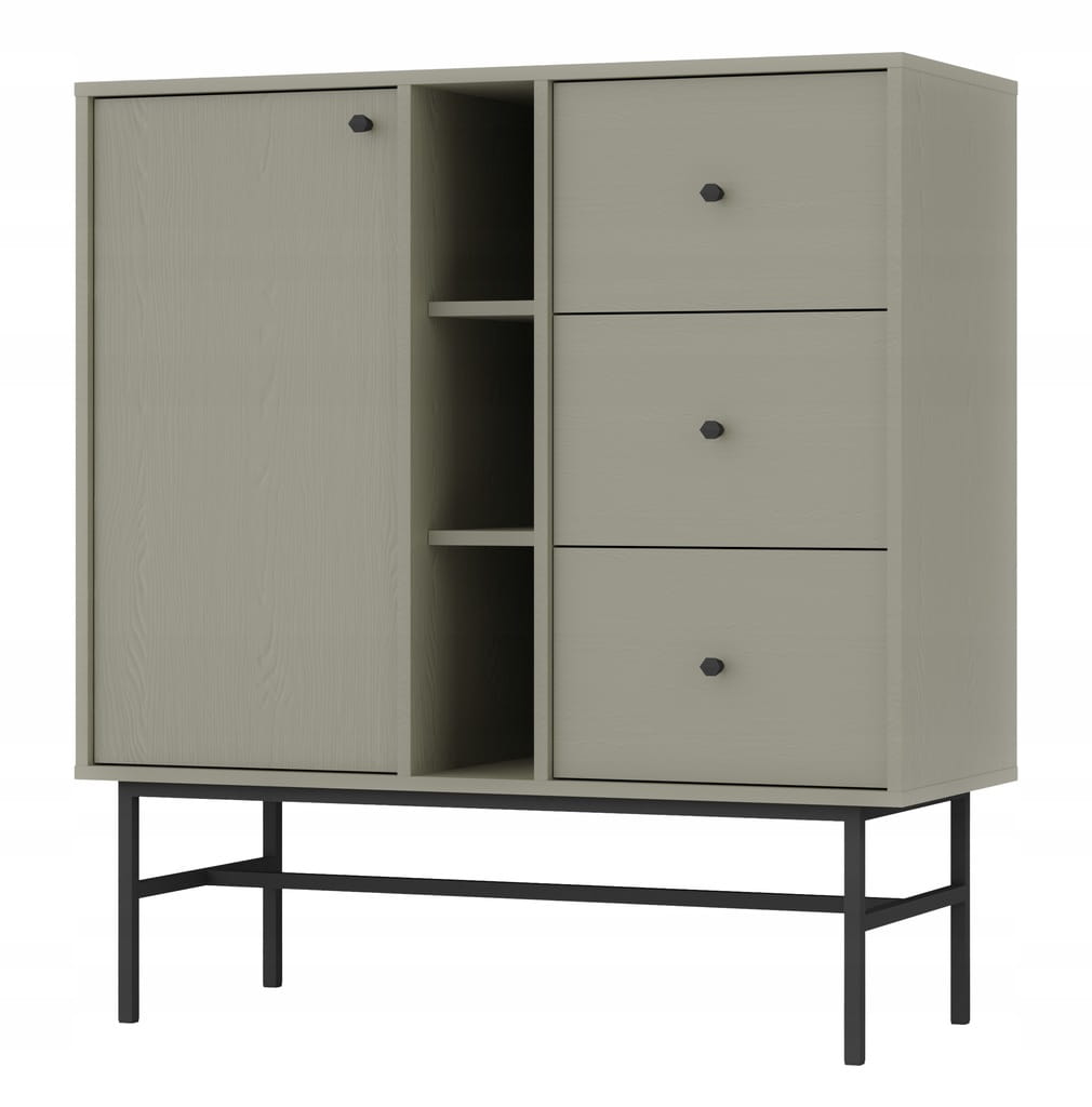 Klikając ,, kup teraz '' zamawiasz komodę z 3 szufladami i półkami SYDNEY 3 na czarnym stelażu w odcieniu eucaliptusu ! W celu zamówienia innego rodzaju komody zapraszamy na pozostałe nasze aukcje