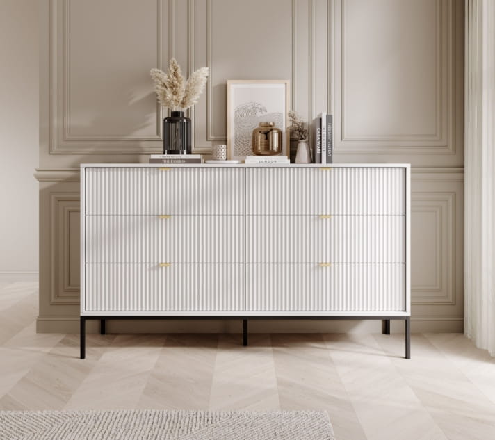 Komoda z szufladami ZANZI sprawdzi się zarówno w nowoczesnych, jak i klasycznych wnętrzach, dodając im wyrafinowanego stylu. Dzięki frezowanym frontom mebel zyskuje dynamiczną strukturę, która odświeża wygląd wnętrza, nadając mu wyjątkowy charakter. Smukłe, wysokie nogi na stelażu nadają komodzie szyku a zarazem ułatwiają utrzymanie porządku.