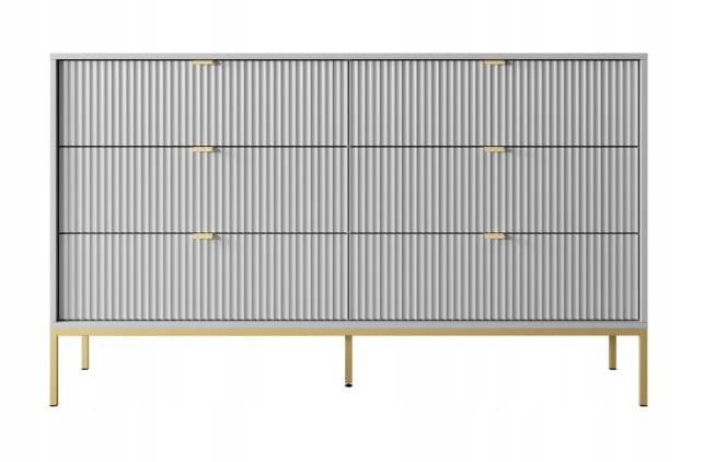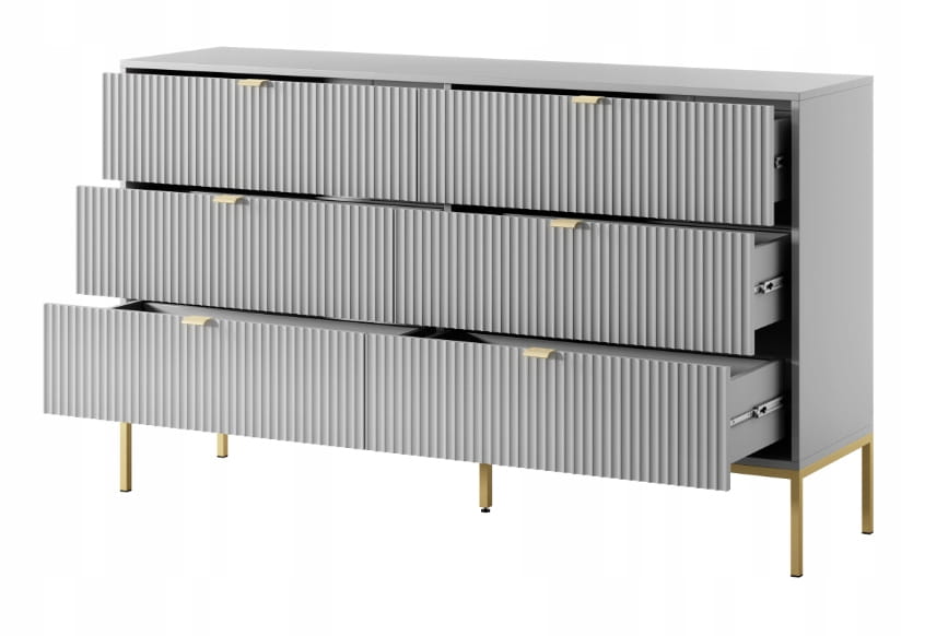Komoda ZANZI 154 x 91 x 39 cm sześć szuflad, lamele SZARY / ZŁOTY STELAŻ