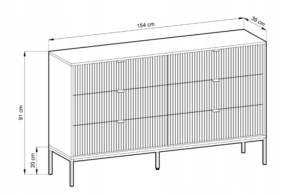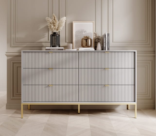 Komoda z szufladami ZANZI sprawdzi się zarówno w nowoczesnych, jak i klasycznych wnętrzach, dodając im wyrafinowanego stylu. Dzięki frezowanym frontom mebel zyskuje dynamiczną strukturę, która odświeża wygląd wnętrza, nadając mu wyjątkowy charakter. Smukłe, wysokie nogi na stelażu nadają komodzie szyku a zarazem ułatwiają utrzymanie porządku.