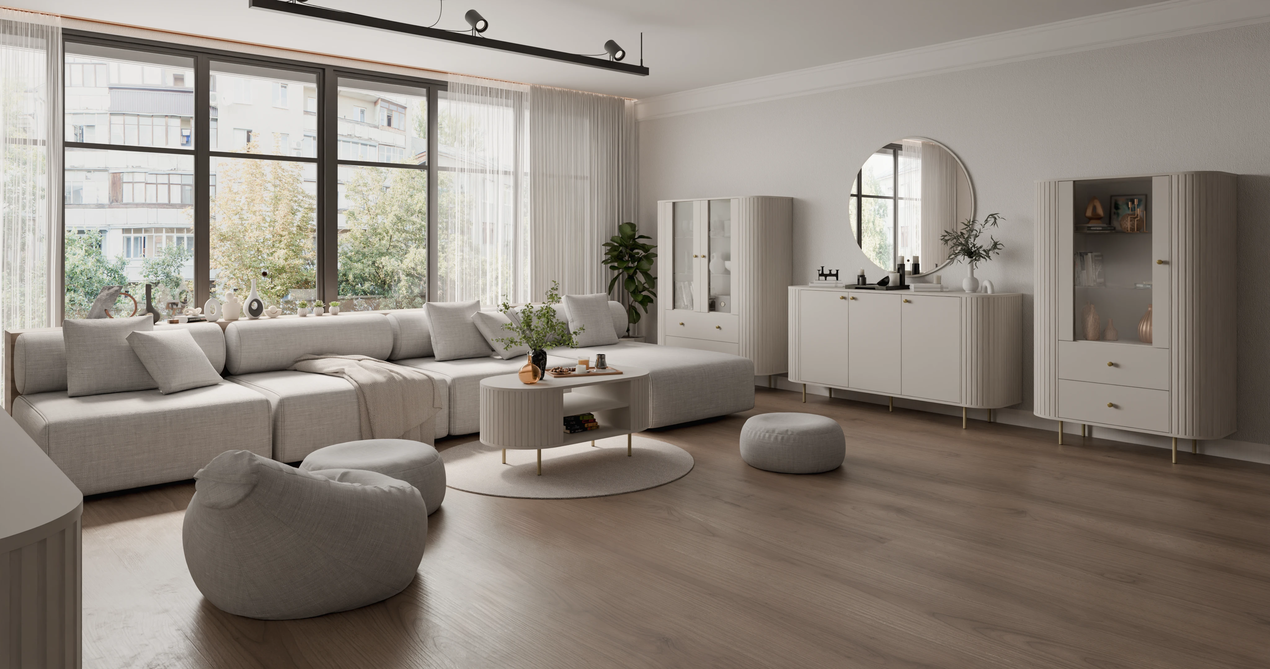 Delikatna, jasna kolorystyka optycznie powiększa wnętrze i wprowadza do niego przyjemne ciepło. Charakterystyczne ryflowane fronty, połączone z minimalistyczną bryłą oraz złotymi lub czarnymi akcentami w postaci metalowych gałek i nóżek, nadają meblom wyjątkowo elegancki, a zarazem nowoczesny charakter. To idealne rozwiązanie dla miłośników nowoczesnych aranżacji, stylu modern classic, soft glam czy japandi.