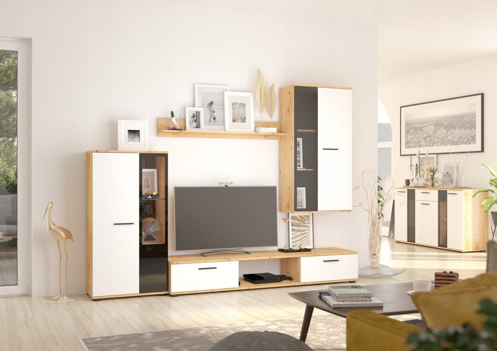 Poszukujesz stylowego i praktycznego rozwiązania do swojego salonu? Meblościanka RIO to idealna propozycja! Wykonana z trwałej płyty laminowanej, zapewnia nie tylko elegancki wygląd, ale także funkcjonalność, której potrzebujesz. Meblościanka RIO to wyjątkowa okazja, aby uczynić swój salon miejscem pełnym uroku i elegancji. Zyskaj więcej miejsca do przechowywania, eksponując jednocześnie swoje ulubione dekoracje.