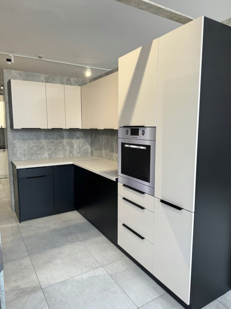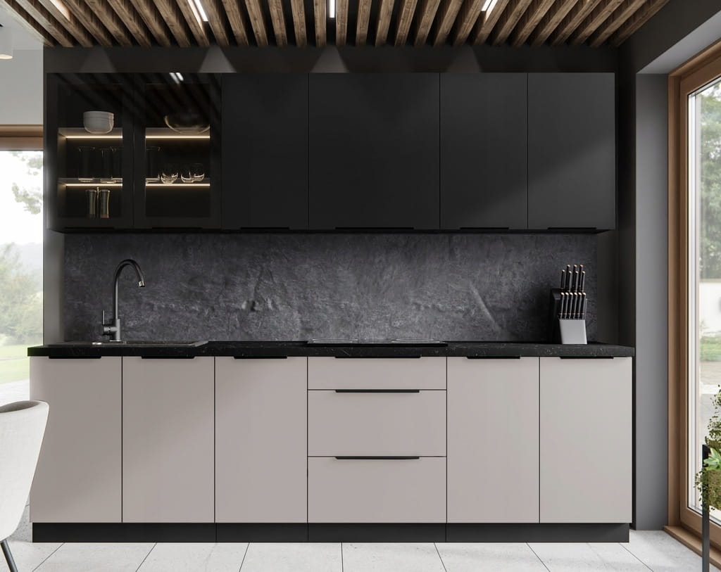 Kolekcja deco / kaszmir to wizualnie imponująca kuchnia która emanuje nowoczesnym stylem, przy jednoczesnym zachowaniu subtelnego, tradycyjnego uroku. Jasne odcienie kaszmiru łączą się z klasyczną czernią, tworząc piękną, dwukolorową paletę. To połączenie zdecydowanie dodaje charakteru całej przestrzeni kuchennej. Czarny korpus w matowej fakturze stanowi eleganckie tło dla kontrastujących kolorów, dodając jednocześnie wyjątkowej głębi. Kaszmir/ deco są to kuchnie modułowe co daje nam możliwość dowolnej konfiguracji i stworzenia zestawu typowo pod swoje potrzeby spośród 60 szafek!