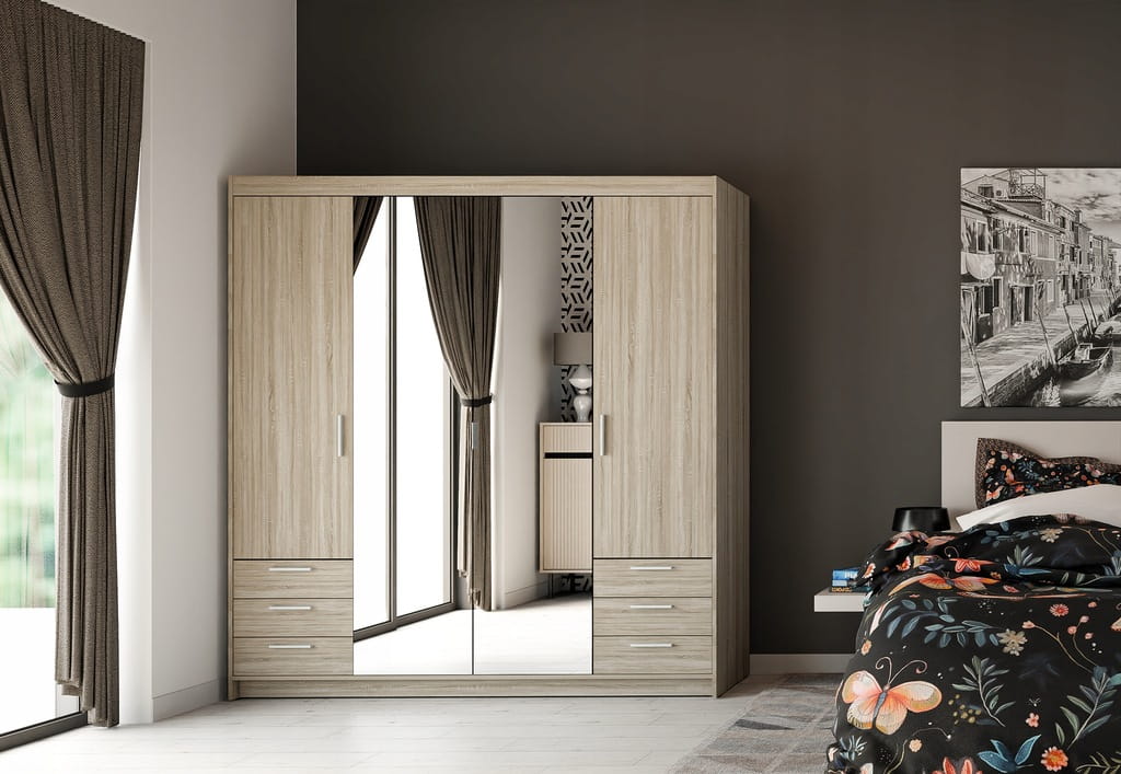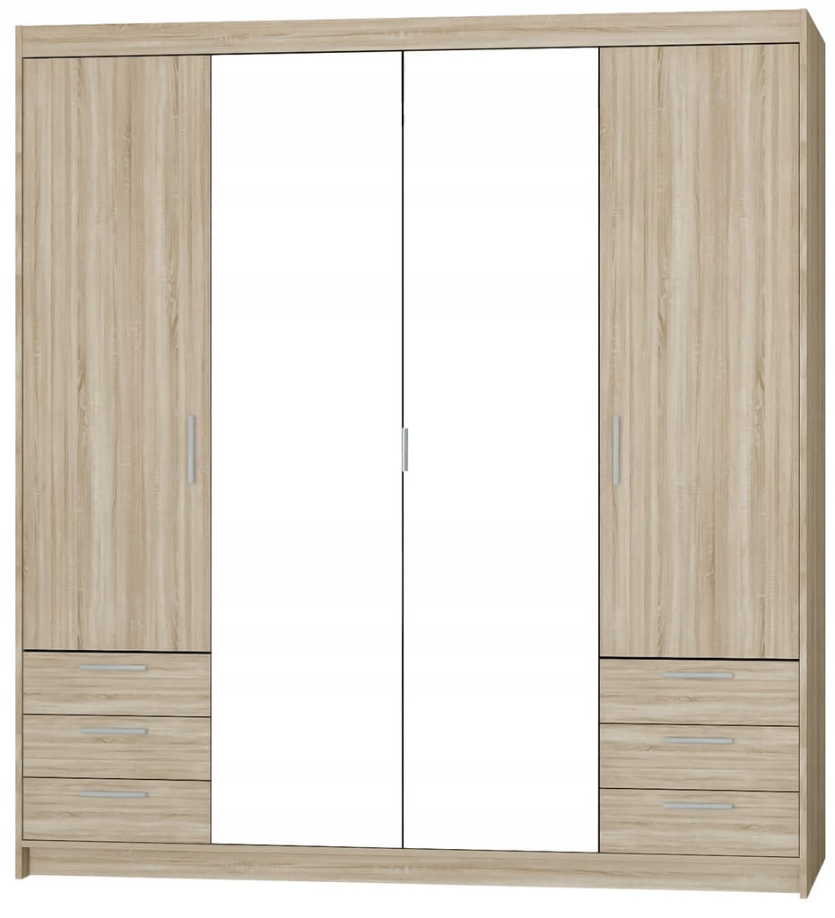 Pojemna Szafa Czterodrzwiowa KLEO lustro + 6 szuflad Garderoba DĄB SONOMA