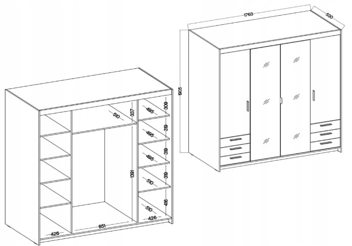 - Szafa czterodrzwiowa wyposażona w 9 półek, drążek na wieszaki oraz 6 szuflad !!