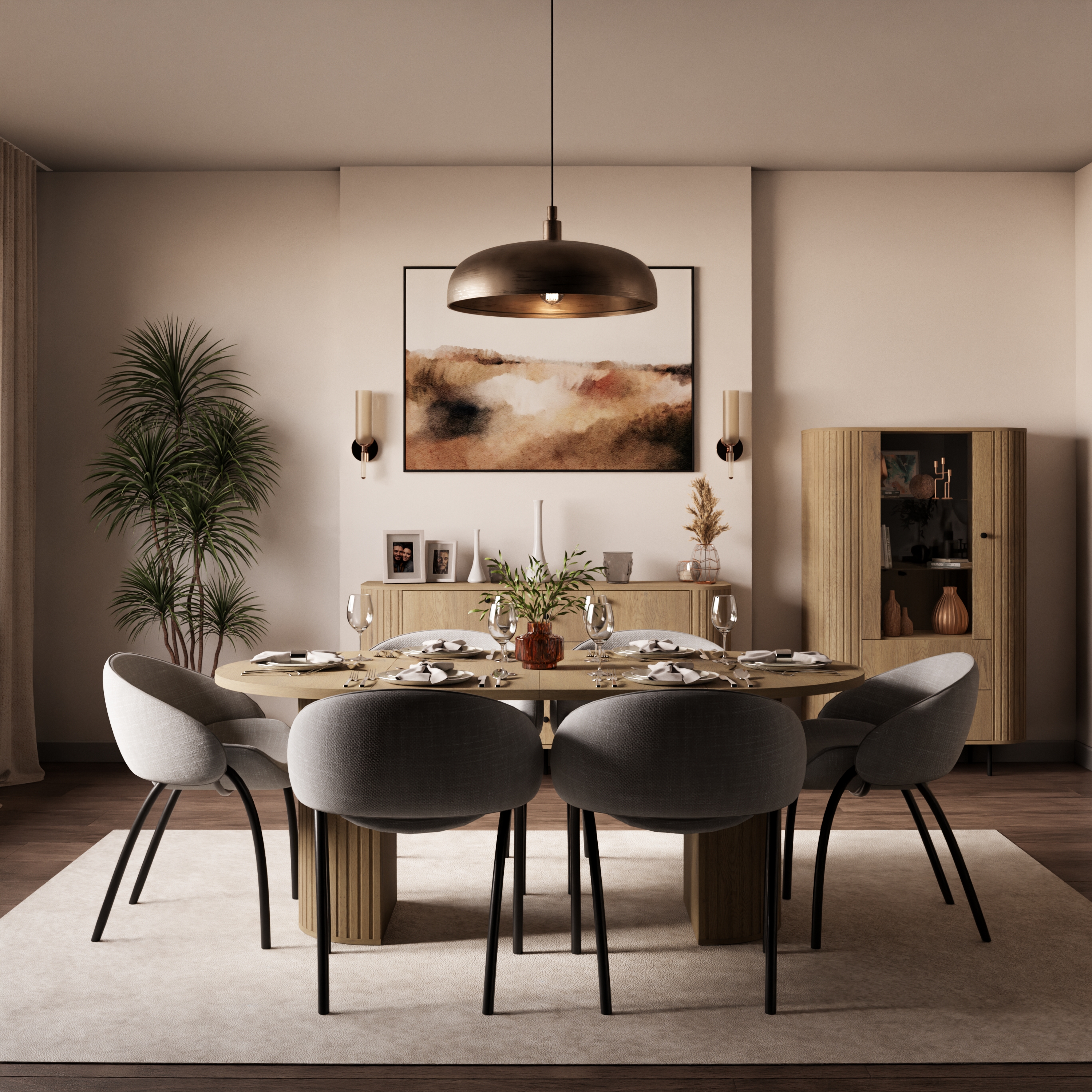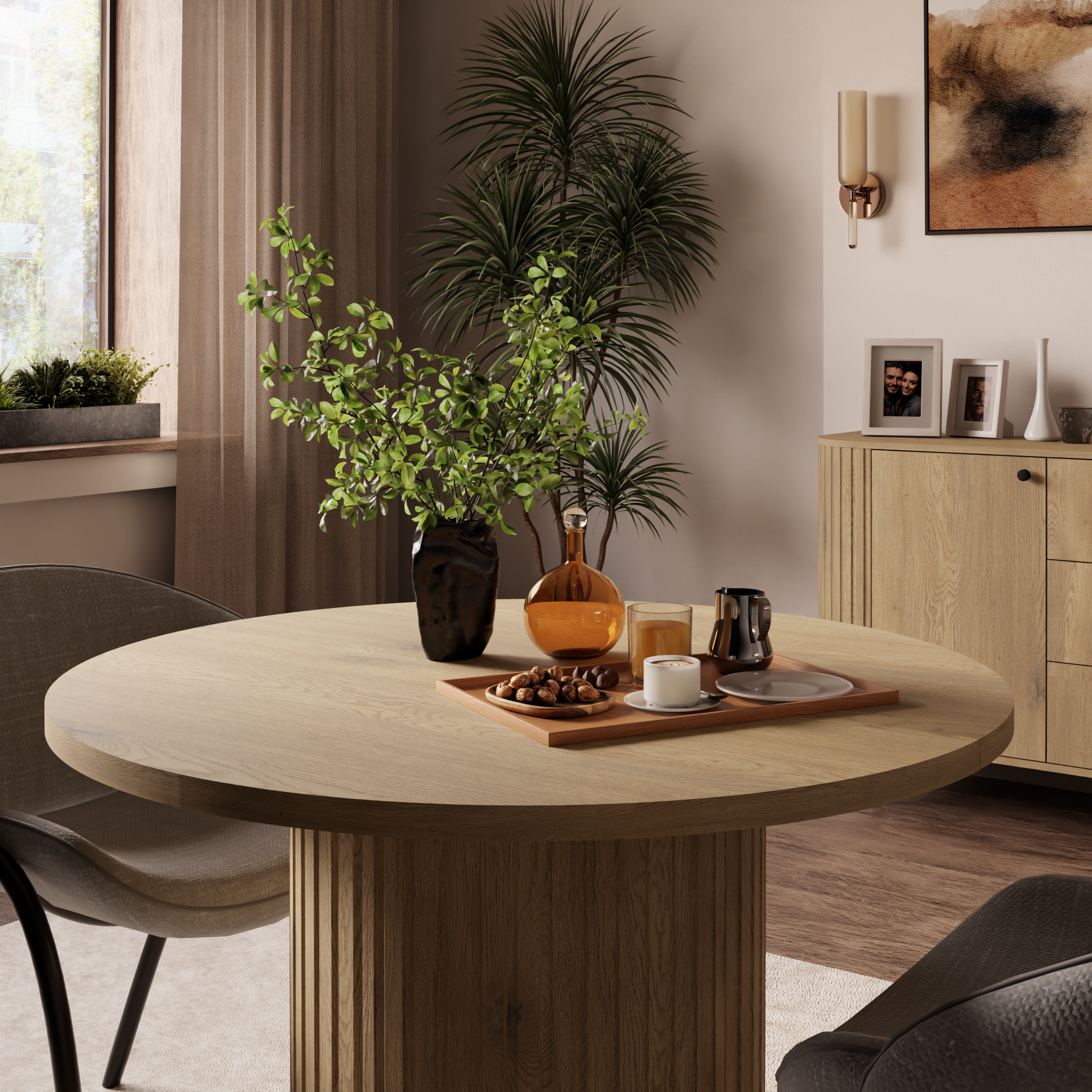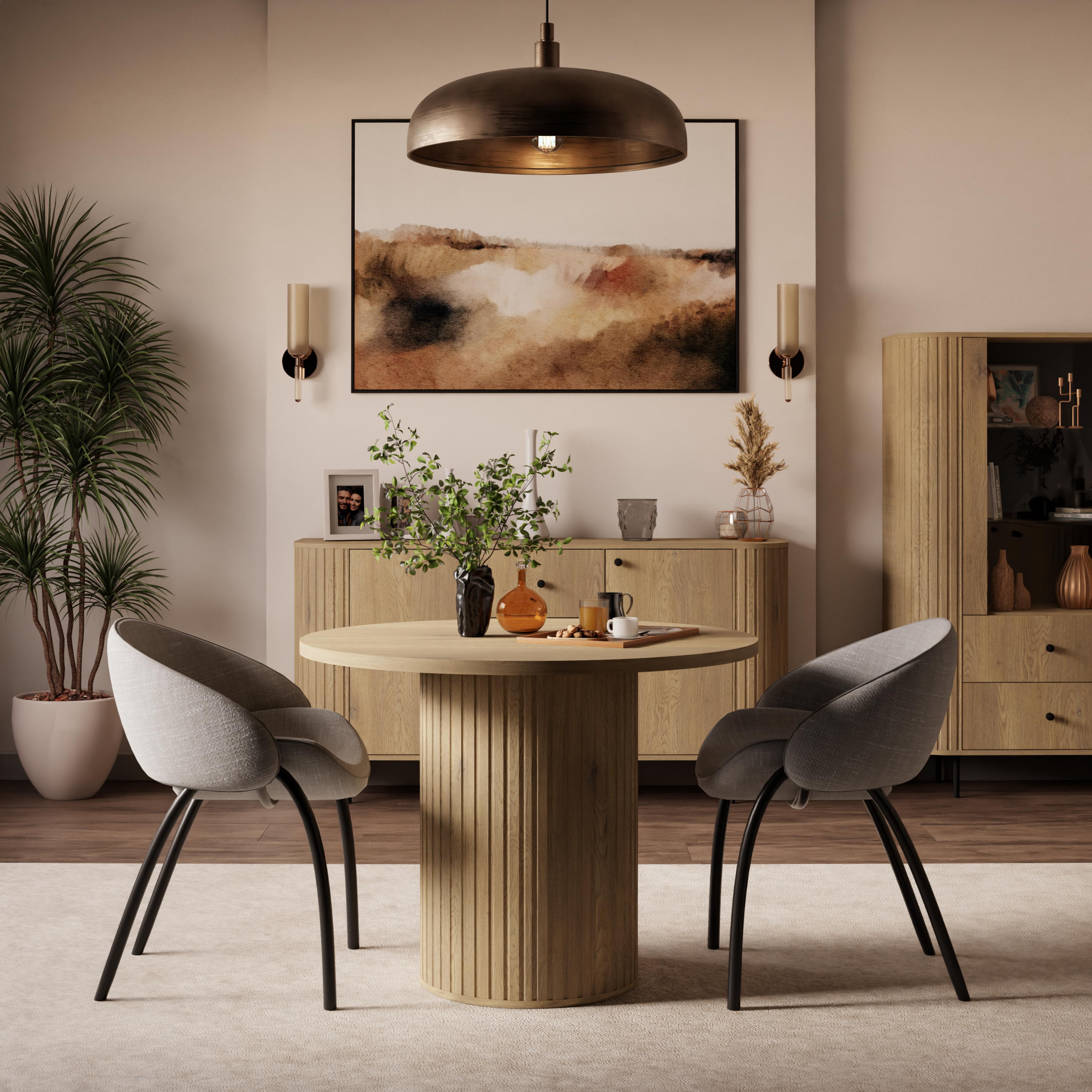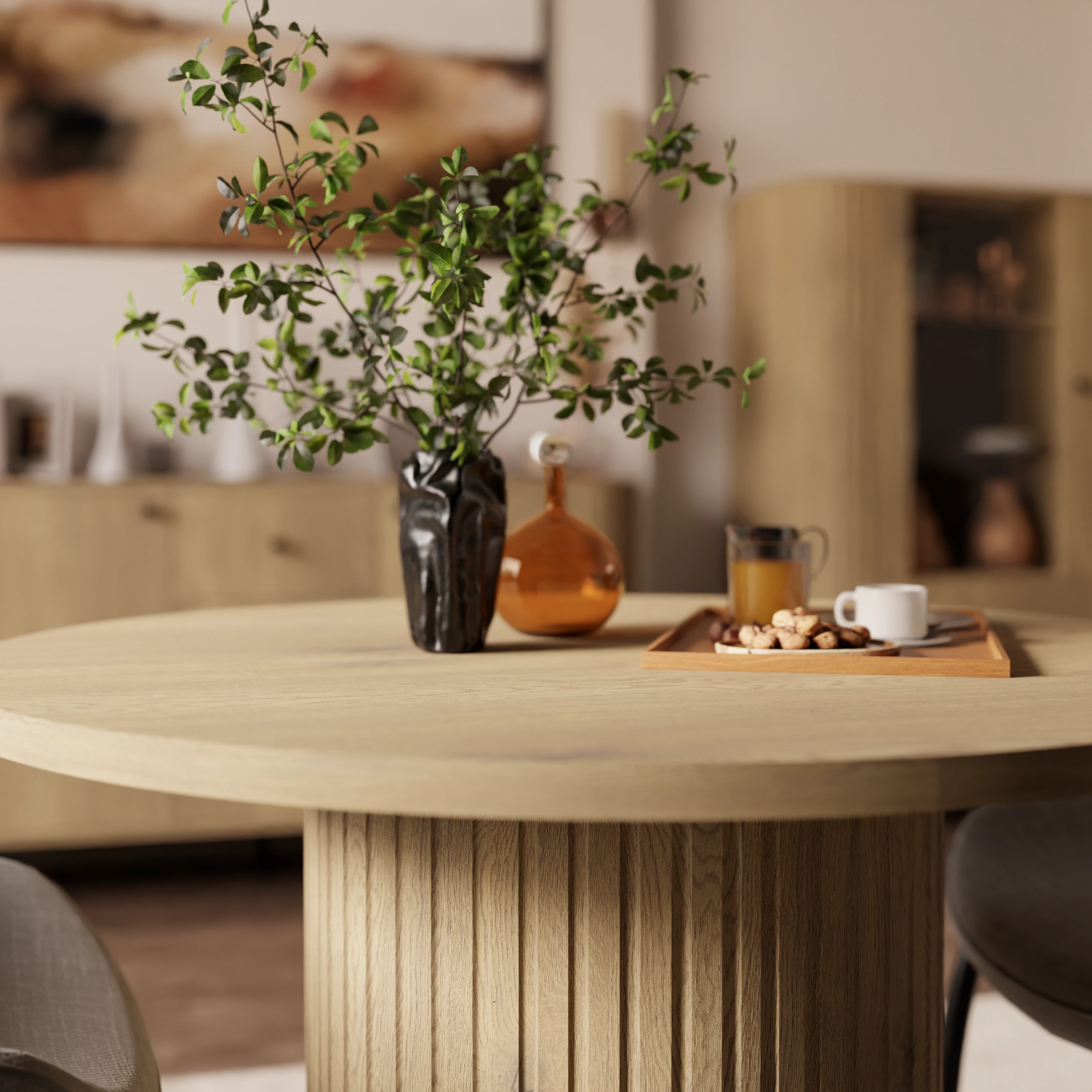 Stół OVELLA łączy minimalistyczną formę z subtelnymi detalami, dzięki czemu pasuje do wnętrz urządzonych w stylu modern, japandi, soft glam czy modern classic. Jasne, naturalne wybarwienie drewna ociepla przestrzeń i optycznie ją powiększa, co jest szczególnie ważne w mniejszych pomieszczeniach. Ryflowane nogi stanowią element dekoracyjny, który wyróżnia stół na tle klasycznych modeli.
