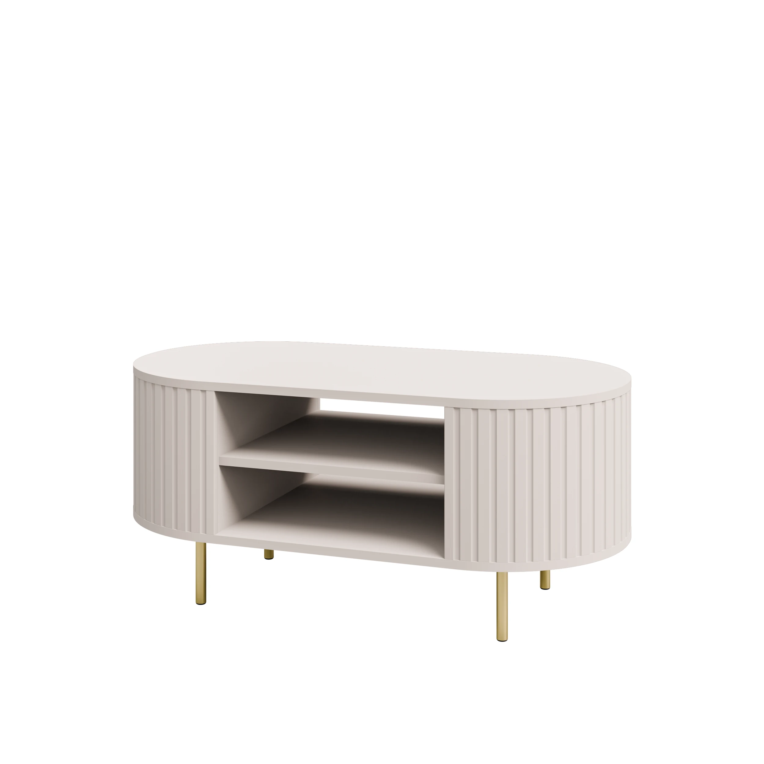 Delikatna, jasna kolorystyka optycznie powiększa wnętrze i wprowadza do niego przyjemne ciepło. Charakterystyczne ryflowane fronty, połączone z minimalistyczną bryłą oraz złotymi lub czarnymi akcentami w postaci metalowych gałek i nóżek, nadają meblom wyjątkowo elegancki, a zarazem nowoczesny charakter. To idealne rozwiązanie dla miłośników nowoczesnych aranżacji, stylu modern classic, soft glam czy japandi.