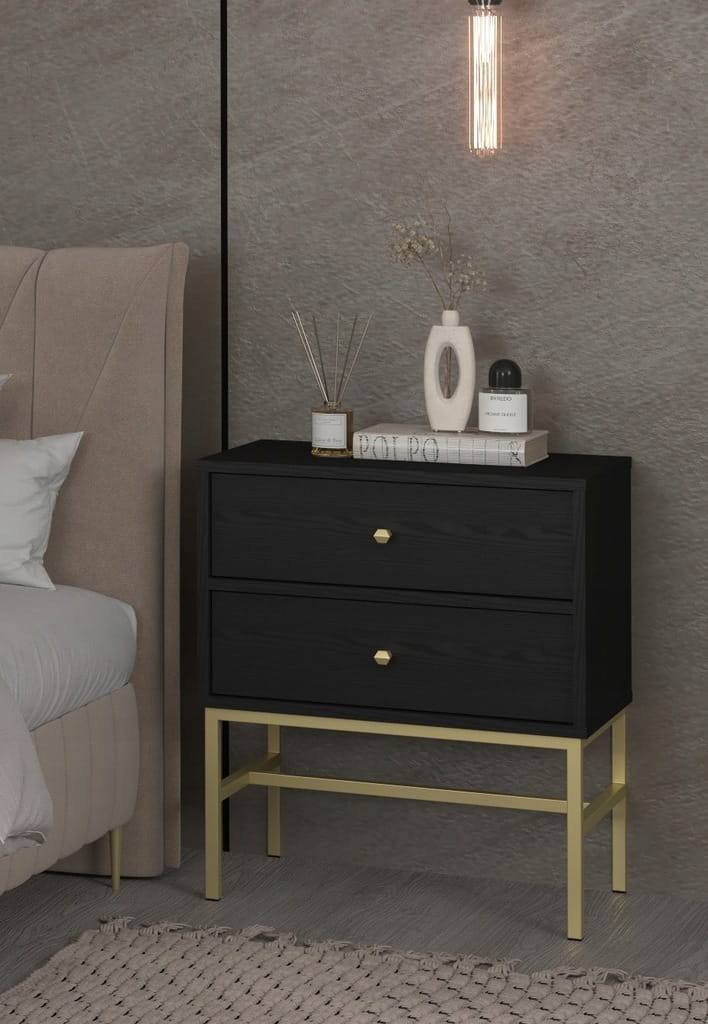 Stolik nocny SYDNEY 3, Szafka nocna 2 szuflady, czarny grafit - złoty