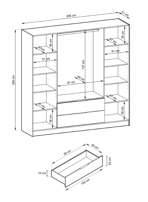 - Szafa zawiera pojemne półki oraz drążek na wieszaki