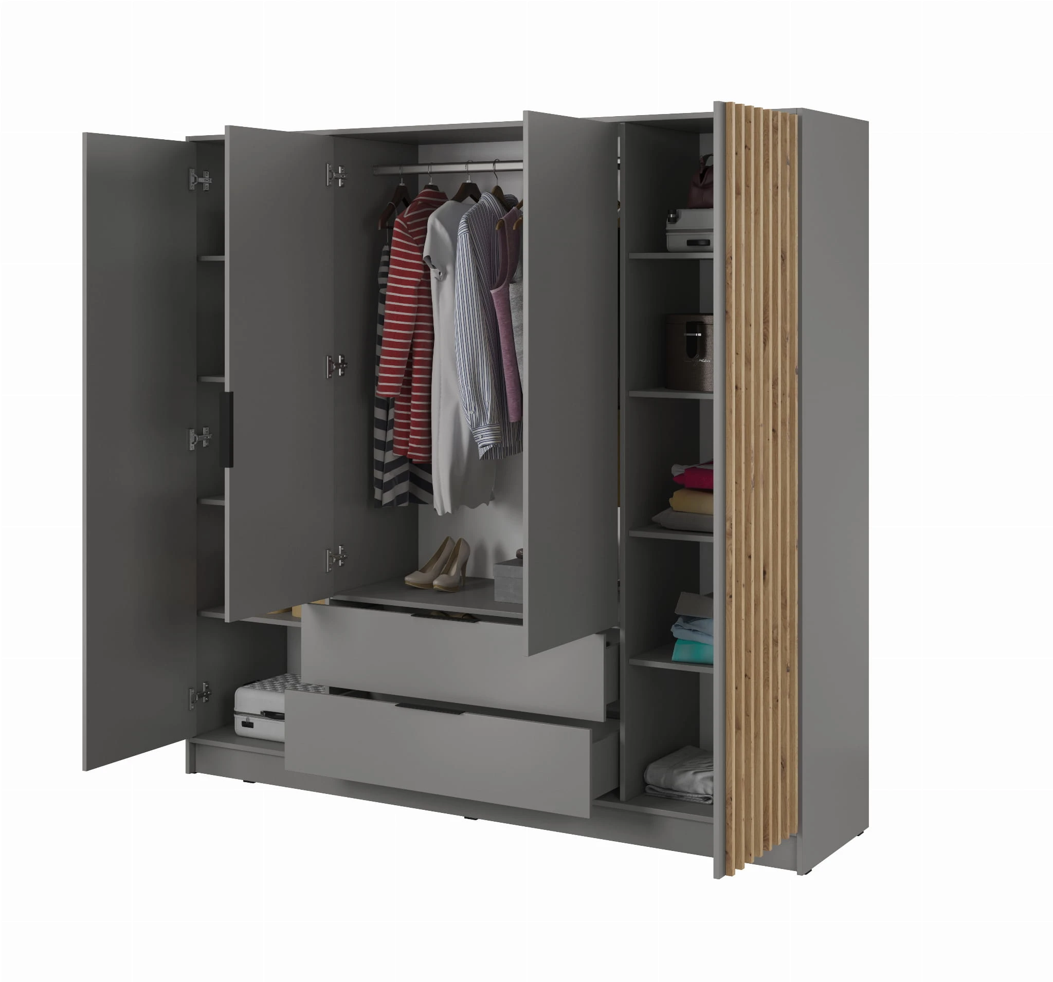 Szafa czterodrzwiowa uchylna MALWA 206 cm z szufladami SZARY / lamela DĄB ARTISAN