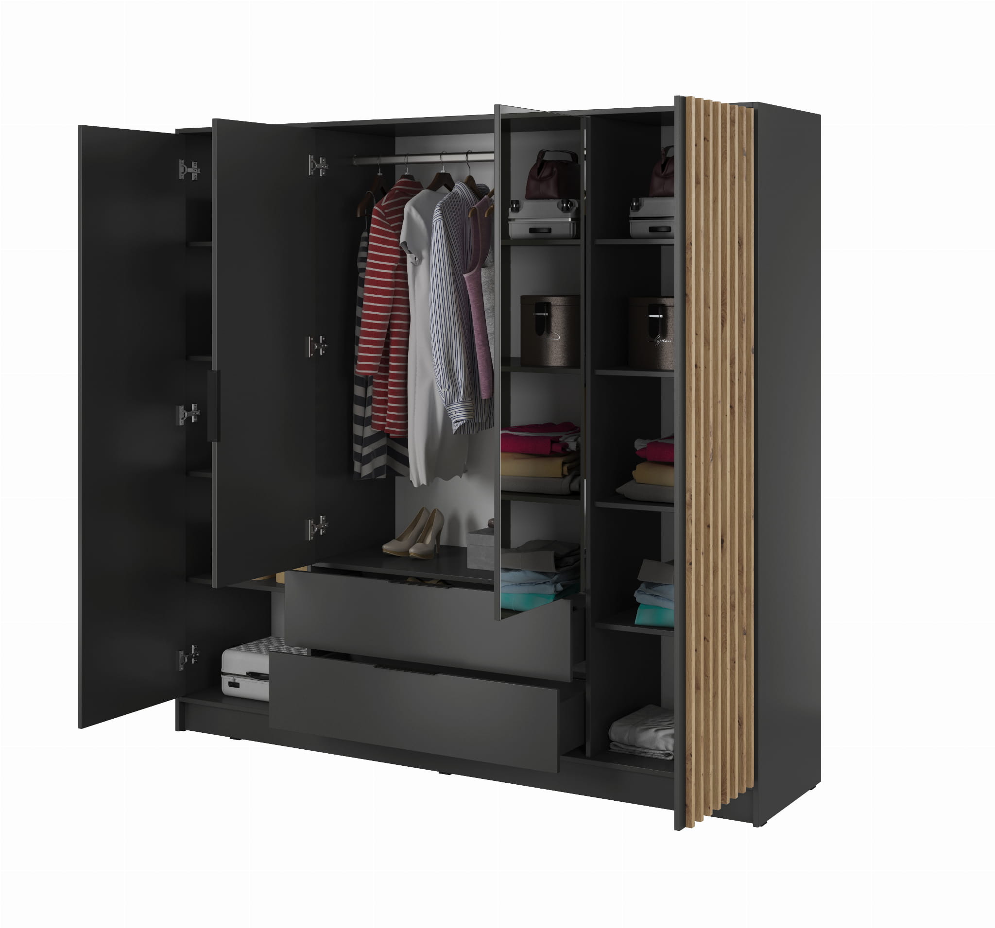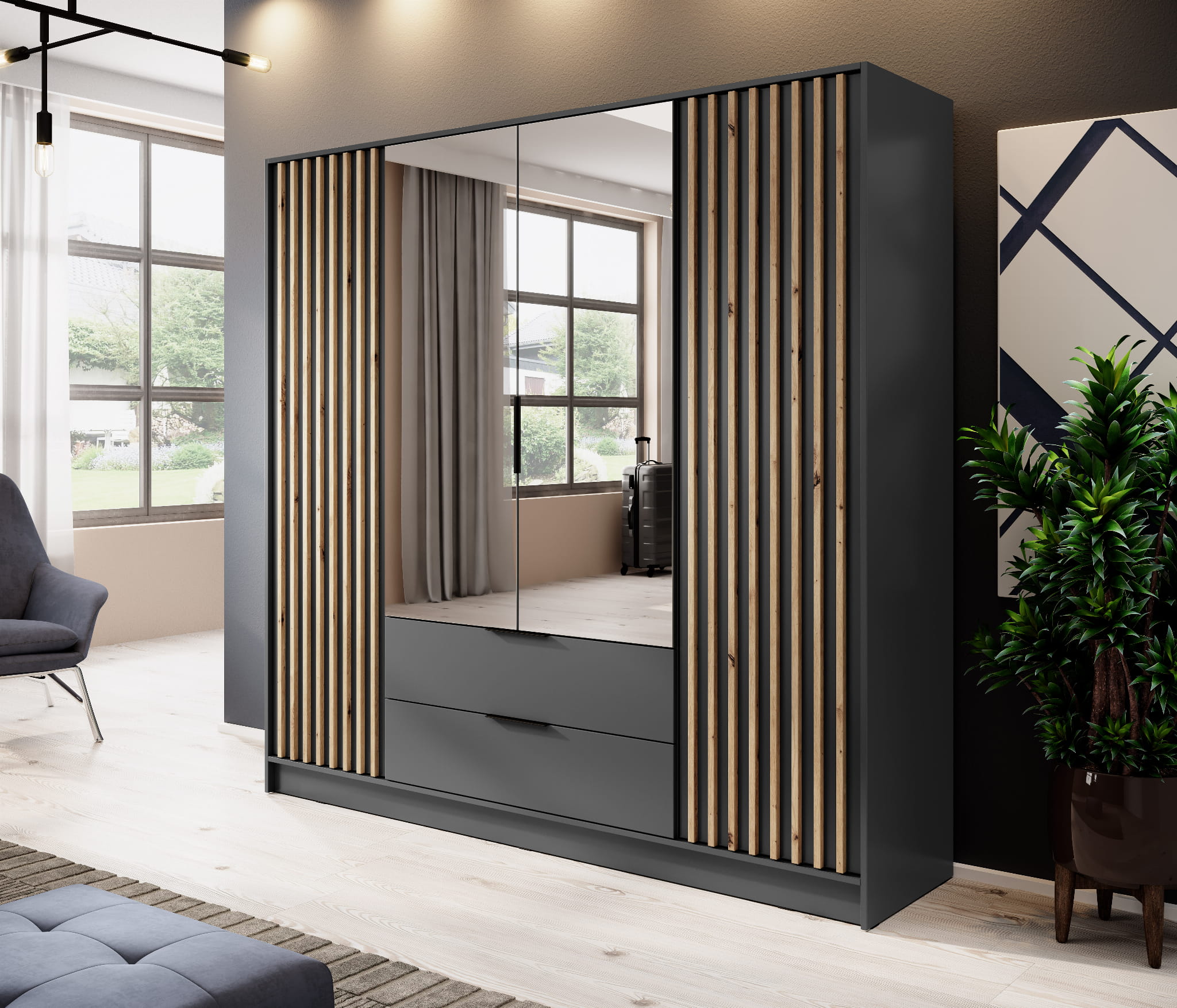 Szafa czterodrzwiowa uchylna z lustrem MALWA 206 cm z szufladami GRAFIT / lamela DĄB ARTISAN
