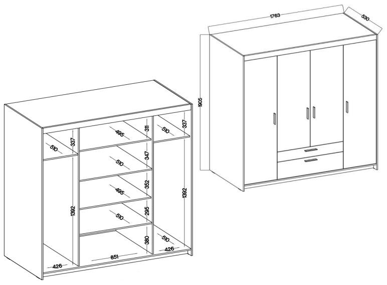 - Szafa w środku: zawiera 6 półek oraz 2 drążki na wieszaki