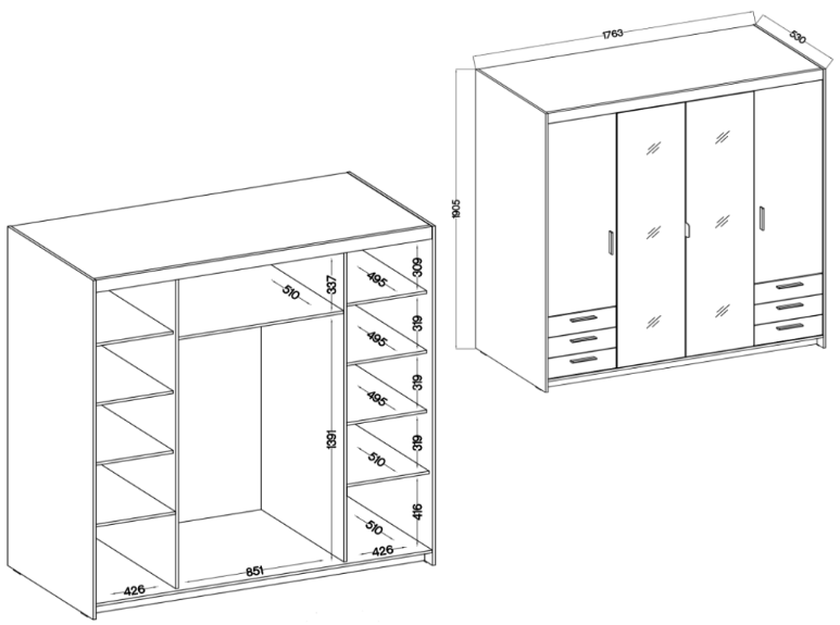 - Szafa w środku: zawiera 9 półek oraz drążek na wieszaki
